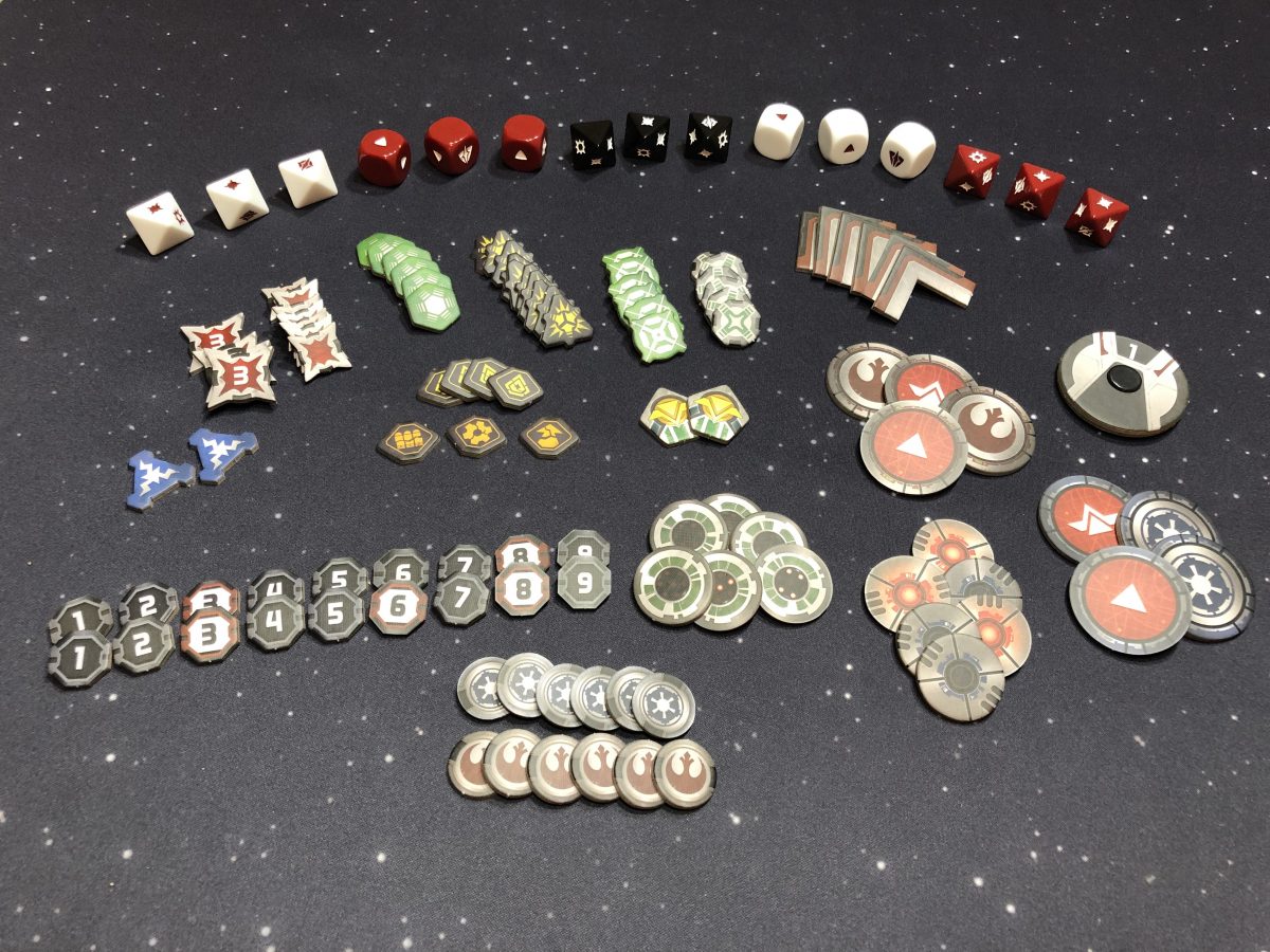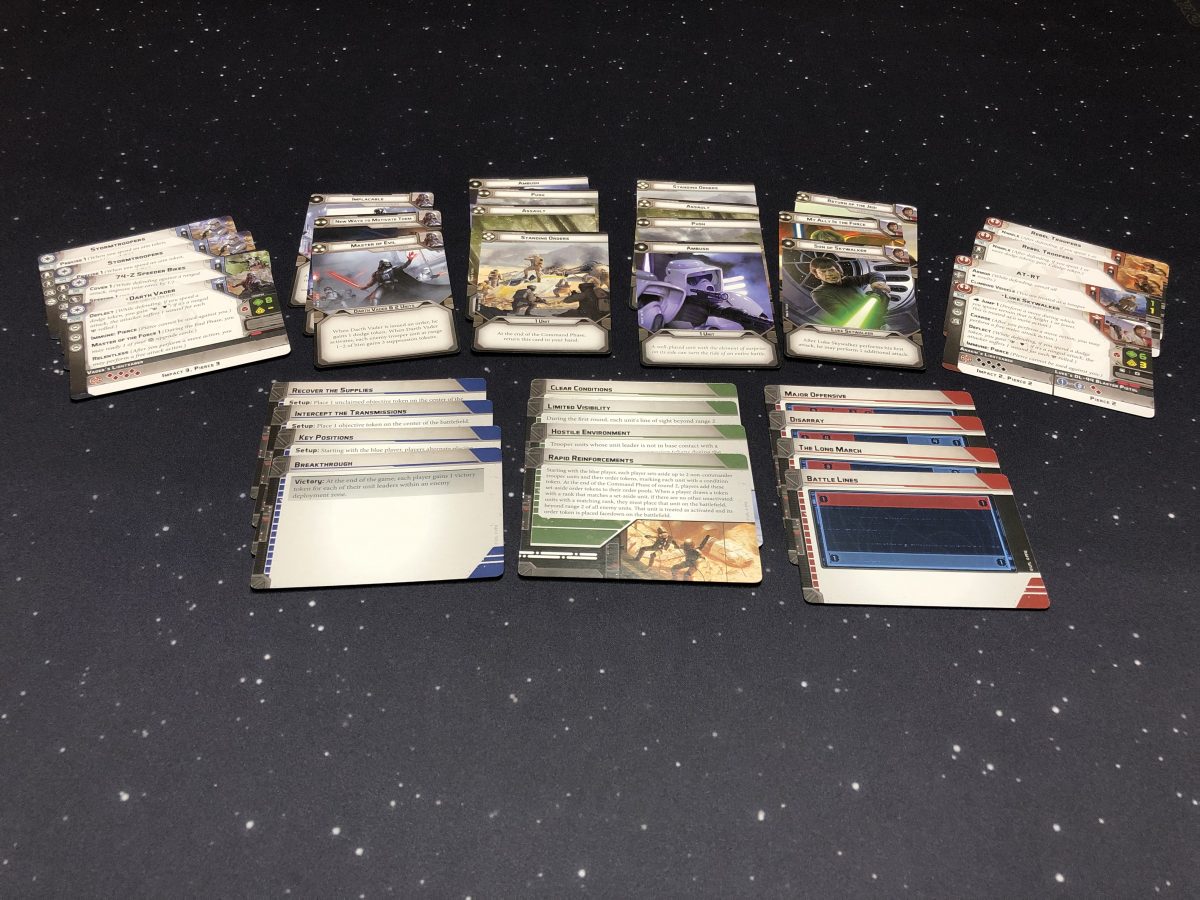 The Star Wars: Legion core set has nearly everything a newcomer needs to get started with the game. Upon opening the box, the first thing you see is the Learn to Play book, artistically graced by an image of Darth Vader’s helmet. Under that is a pile of goodies including dozens of plastic pieces, dozens of cardboard tokens and dozens of cards. There are thirty-three plastic minis and eight plastic barricades. Other plastic parts include a range ruler, three movement tools and fifteen custom dice. There are dozens of tokens that help you track everything in the game. Two different sizes of cards round out the collection: playing card-sized unit, command and battle cards; and Fantasy Flight Games’ favorite half-sized cards with unit upgrades on them.