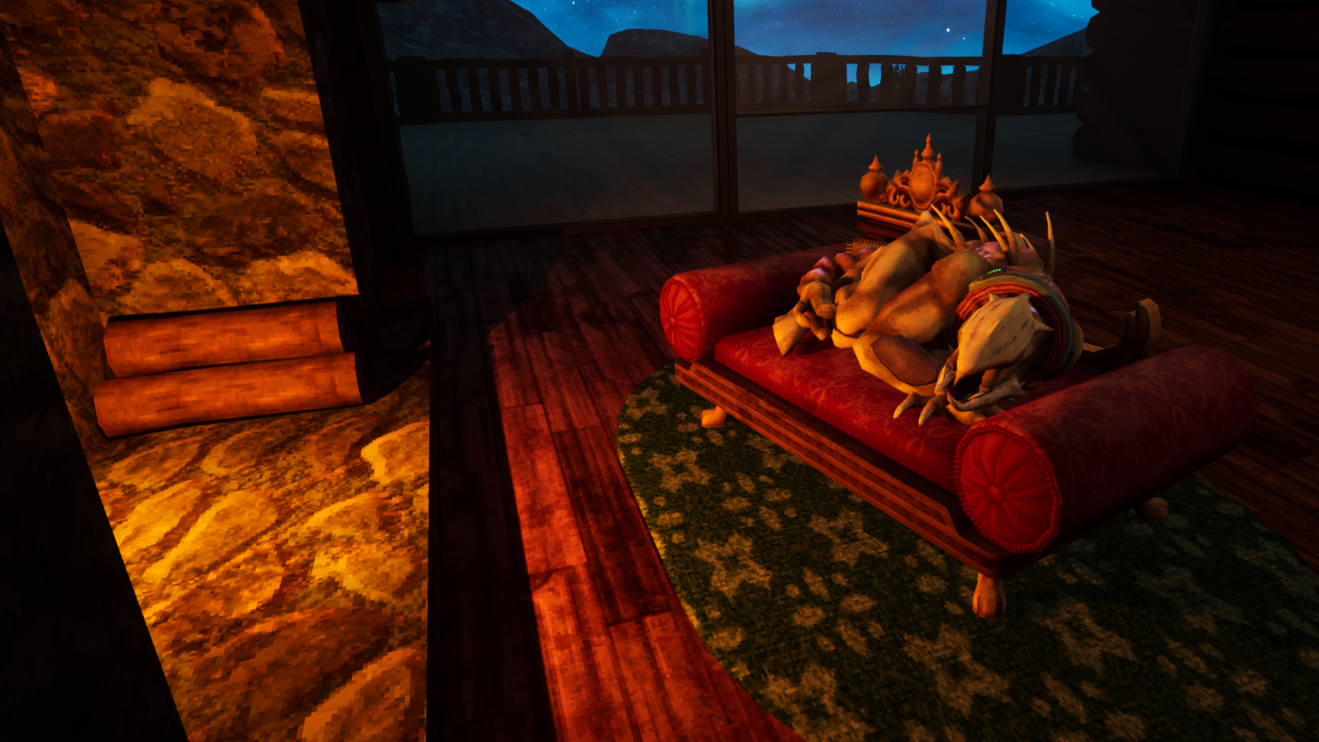 Peccary on the couch in the Winter Cabin Home World! Showing us that we might be able to take our pets with us into the Home Worlds. The couch is special as well because it showcases pet furniture. Something that we don't have in the game yet.