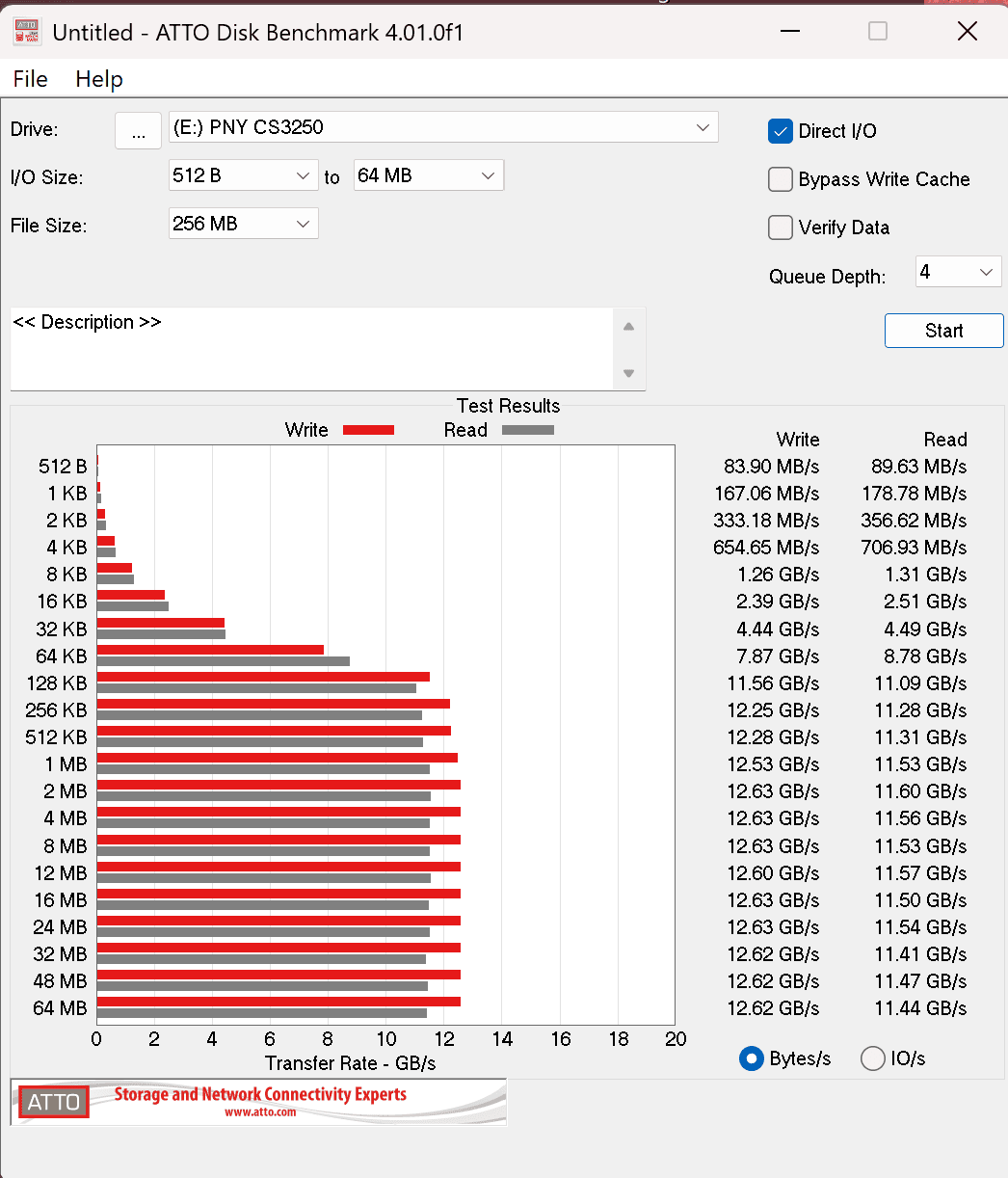 It's amazing to see numbers like this. While the read speed came in underneath the max for this synthetic test, but to see the write speed almost hit the maximum is insane. These sorts of speeds were unheard of outside of the commercial space. Seeing it in a consumer drive is unheard of, but that's precisely what PNY is delivering here. Let's jump to ATTO for that block-by-block breakdown.