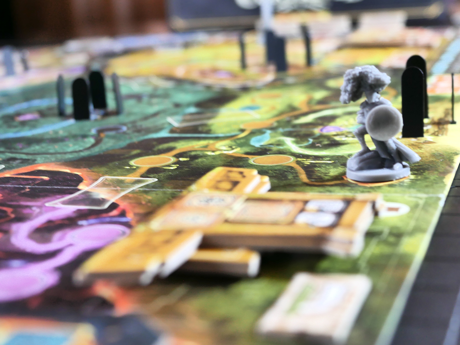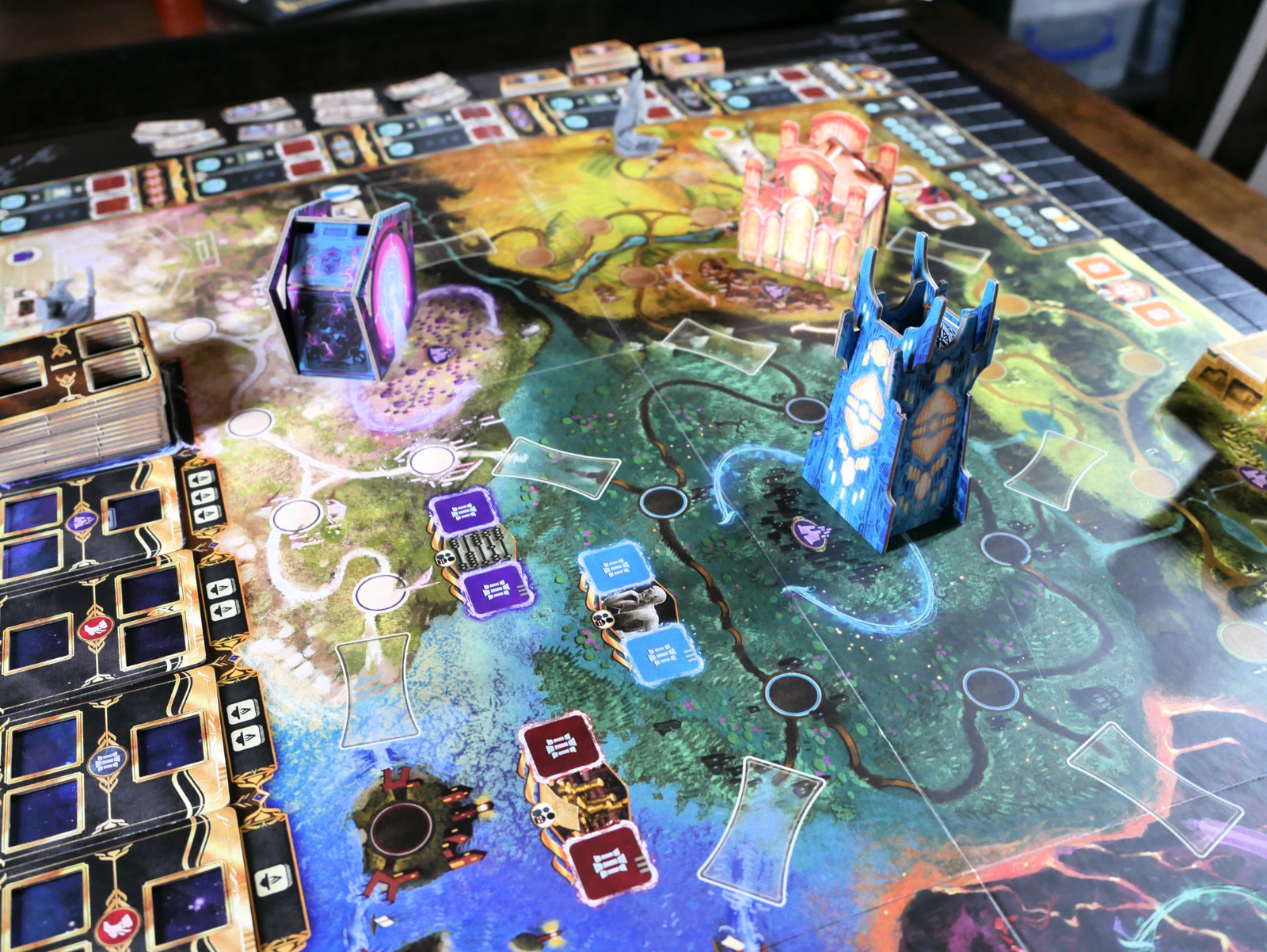 Despite how polished the prototype was, it was very clear that Chris Matthew and his team were still working on the game even up to and after the Kickstarter launch. We were getting rules clarifications from one game to the next at times, which just tightened things up from session to session. Some notable patterns did emerge after multiple plays: several games started off with a mad dash to nab up all of the good transmuter tiles before everyone else did, for instance. It was also a little odd at how most of the action on the game board revolved around building monuments more than moving your avatar miniature around on the board. It’s a big board!. These are nitpicks, however, and the tactile joy of snapping a piece of a monument magnetically to its corresponding metal frame jutting up from the board was the one thing every player seemed to agree was a satisfying highlight of the game.
