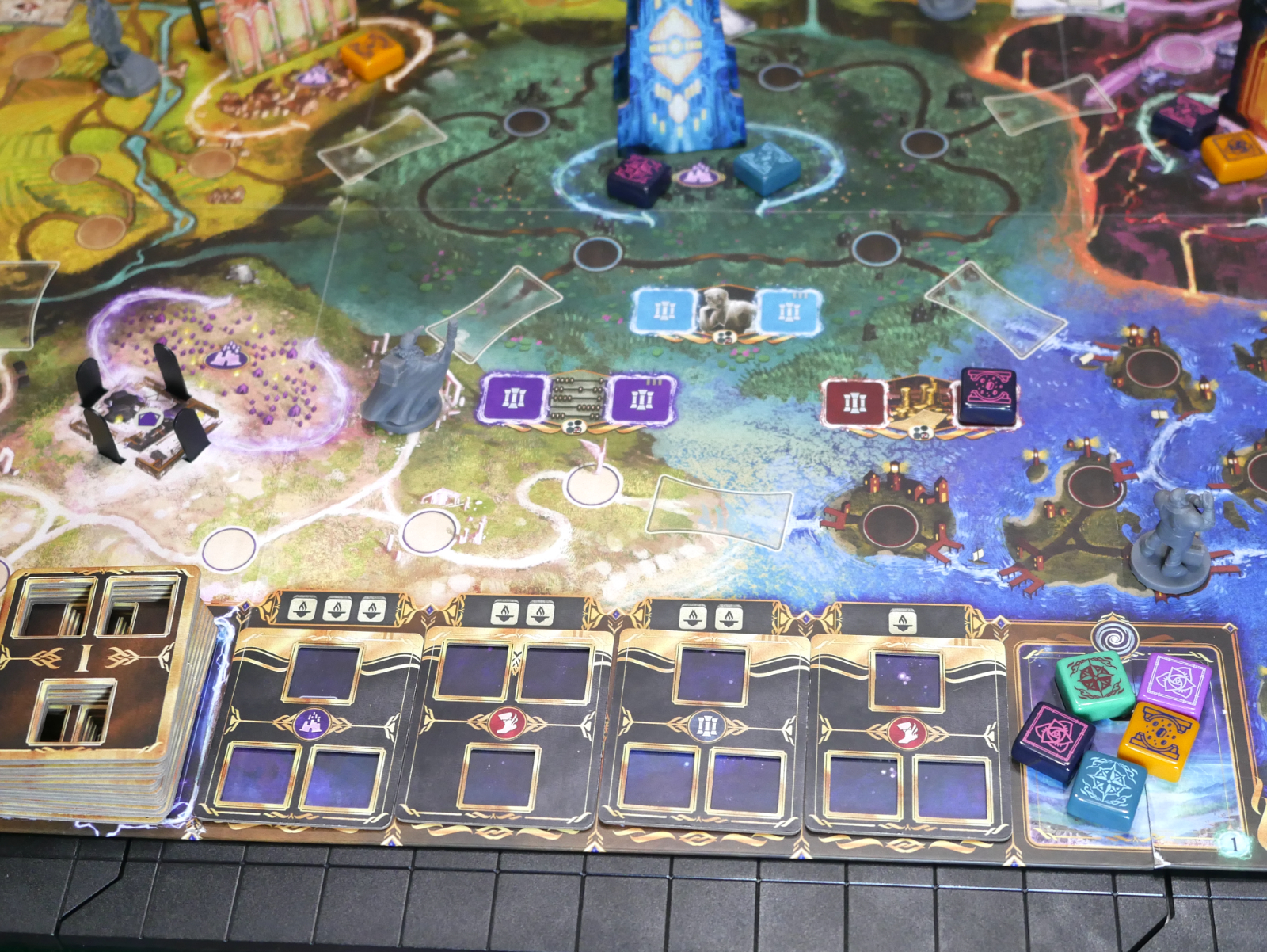 Taking the Deploy action is by far the most consequential and important thing a player does during their turn. Deploying is the only way to build monuments, which are the other main focus of the game. Building these monuments, section by section, enable players to unlock more energy tiles from their reserve, gain one-time benefits such as gaining link tokens or moving your avatar through the mortal realm, and unlocking the full potential of the different types of energy placed once the monument section is complete. The god that completes a section of a monument gets to place it on the board, then binds their completing token to the monument, which takes it out of play but scores points in the endgame.