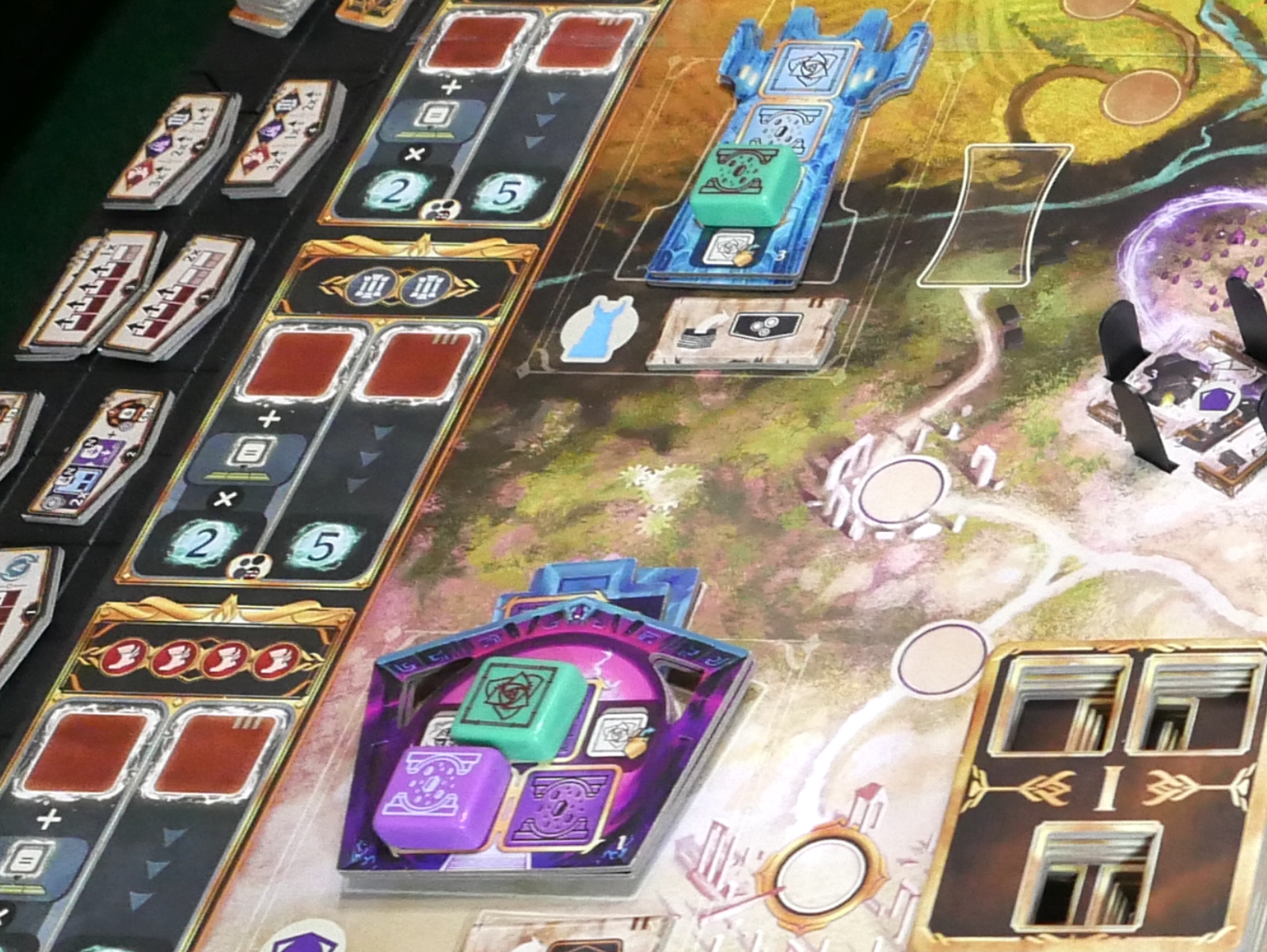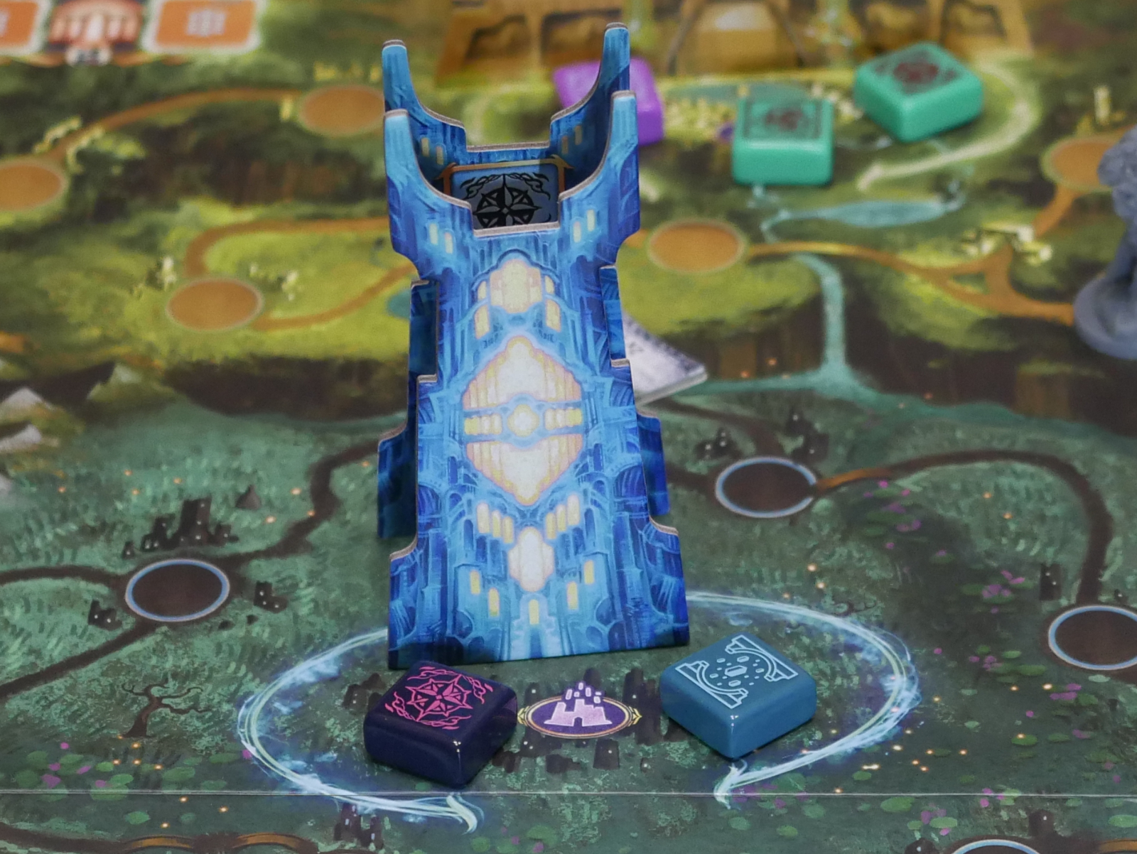 The player who completed the monument section does not activate the last token placed, instead, that energy token is bound to the monument until the end of the game, scoring points for the player after the end of the game is triggered. The end of the game is triggered when the last section of the last monument is built, allowing for the other players to take one last turn if they didn’t get the same number as the player who ended the game.
