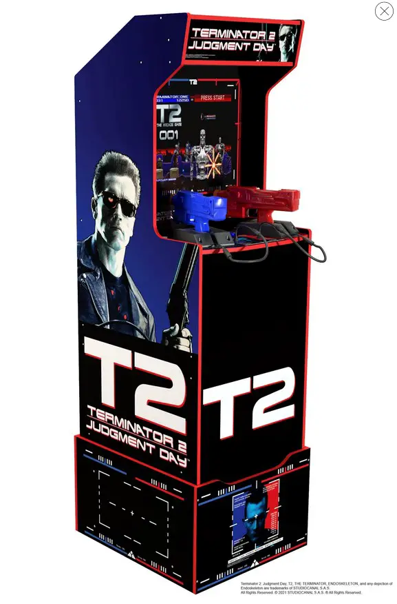 The Terminator 2 Arcade Machine available directly from Arcade1Up includes two guns with force feedback, light-up marquee, custom riser, and WIFI for leaderboards.
