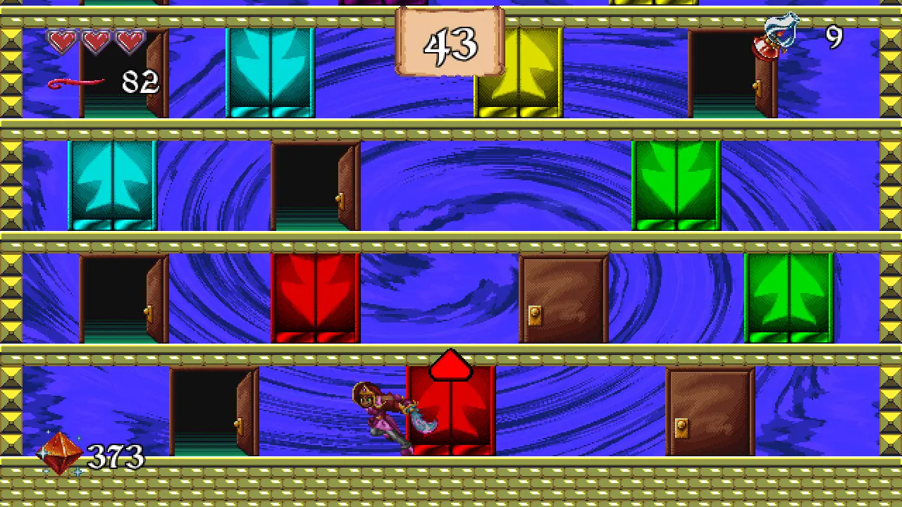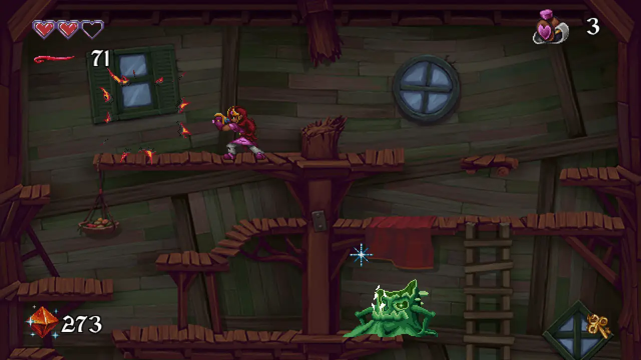 Just like the CDI games that inspired it (not you Zelda’s Adventure), Arzette is a level based 2D platformer. Playing on Switch, you move with the D-Pad or left stick, jump with B, swing your sword with Y, use items with X, shoot your gun with A, and perform the iconic duck walk by holding down and moving left or right. It’s simple to grasp, but level design can be deceptively difficult. Unlike the CDI games, however, these levels actually feel good to move through thanks to tight controls, great pixel art animations, and clear delineation between what is a platform and what is not (most of the time). Enemy placement can sometimes be unfair, even after you get the gun and trivialize most combat, but as you become familiar with each level you’ll naturally learn how to navigate around or through them.