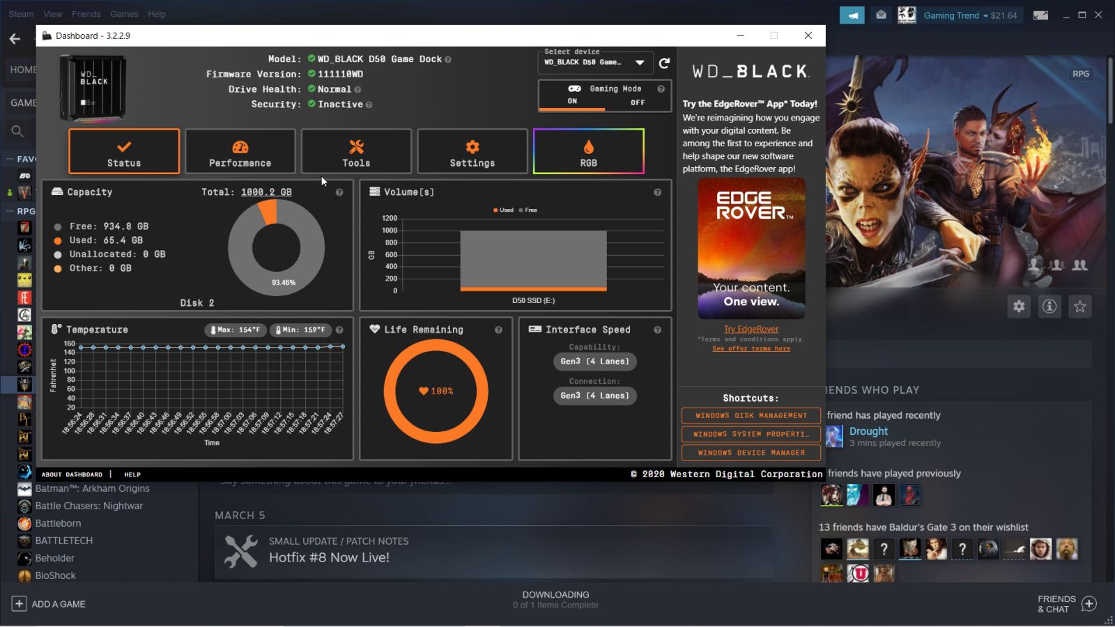 While it is in no way required, Western Digital also has a software suite called WD_Black Dashboard. This allows you to monitor the overall health of the drive, as well as the temperature, if the dock is utilizing all four PCIe lanes for speed, a graph of read and write speeds, firmware management, and much more. There’s also a “Gaming Mode”, though I was not able to see any difference in overall speed. This dashboard is free and doesn’t eat up much in terms of resources, so it’s good to run every once in a while to check for overall operating health.