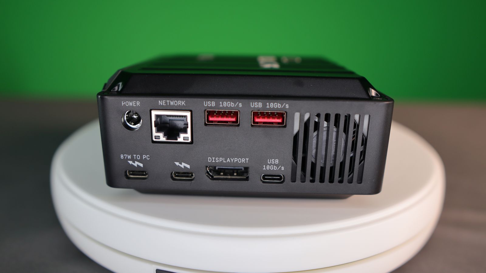 The WD_Black D50 Game Dock has a total of 10 ports on it. On the front of the device lies one USB Type C Thunderbolt 3 port, a USB-A 10Gb/s port, and a 3.5mm audio/microphone port. Heading around the back, we have a Gigabit Ethernet RJ-45 jack, one DisplayPort 1.4 port, the second USB Type C Thunderbolt 3 port, two additional USB-A ports for your mouse and keyboard (though 10Gb/s is so overkill for such peripherals), as well as a Type-C port for a second monitor, and the final Type-C port to connect to the laptop. That last port has an additional trick up its sleeve that elevates the D50 game dock above its predecessors.