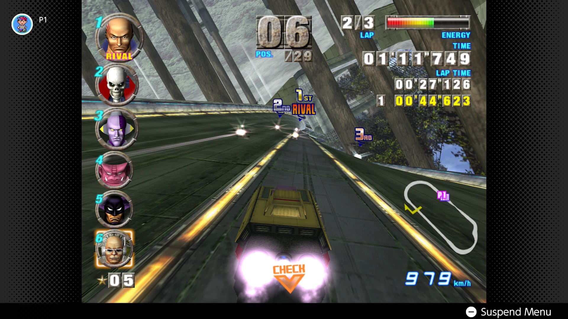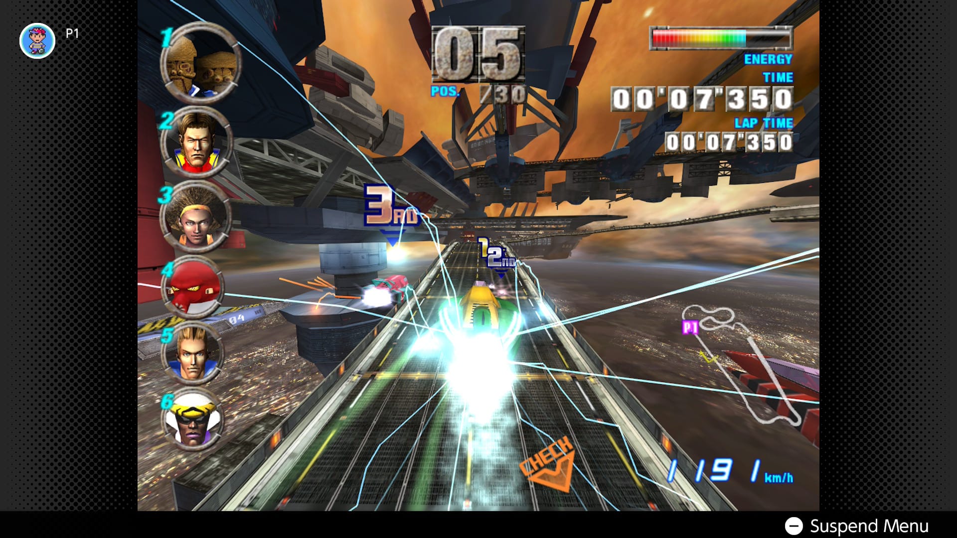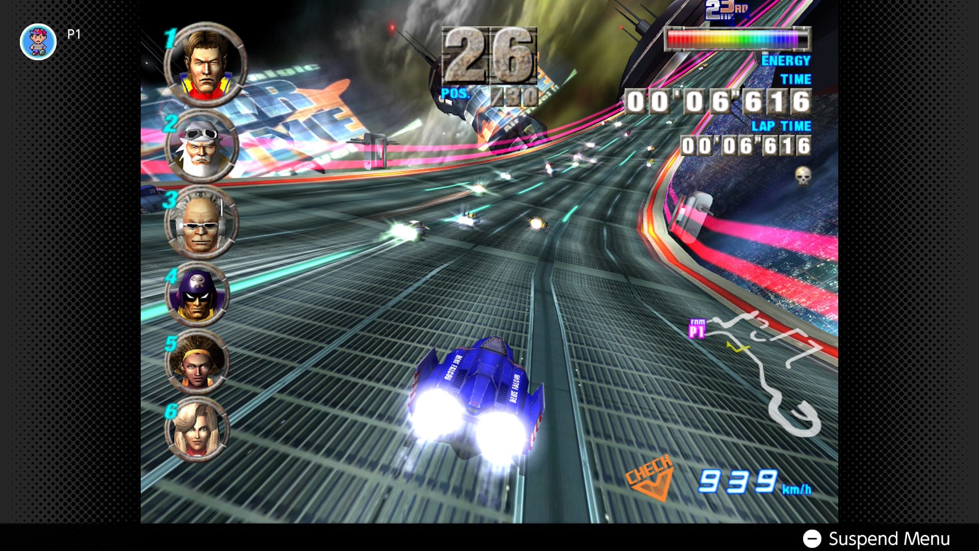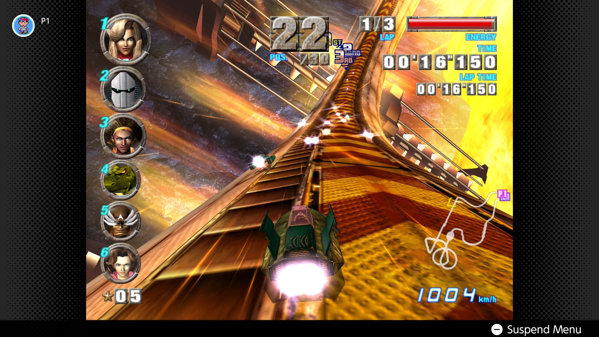 And how good it still looks! Whereas N64 predecessor F-Zero X wisely sacrificed detail for framerate, the GameCube’s graphical prowess can finally juggle both: from Port Town’s bustling airspace to Sand Ocean’s sea of ancient tech and carnivorous ecology, it decorates each course with just enough worldbuilding that never distracts from the cutthroat racing. Any rare moments where F-Zero GX shows off are always in service to the gameplay; namely, Cosmic Terminal’s mile-high drop, awing even today with the thrill of plummeting down, down, down a cavernous space station, tasking the player with landing on any three branching paths. (There’s only one visual weakness in the emulation: the character portraits are all pixelated without the CRT filter. Ack!)