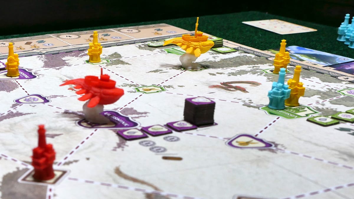 Mistwind is a heady mix of pick-up-and-deliver, route management, and a unique action economy that is as fun to play as it looks on the table. Have we mentioned the flying whales, yet? Expect a review of this great game soon.