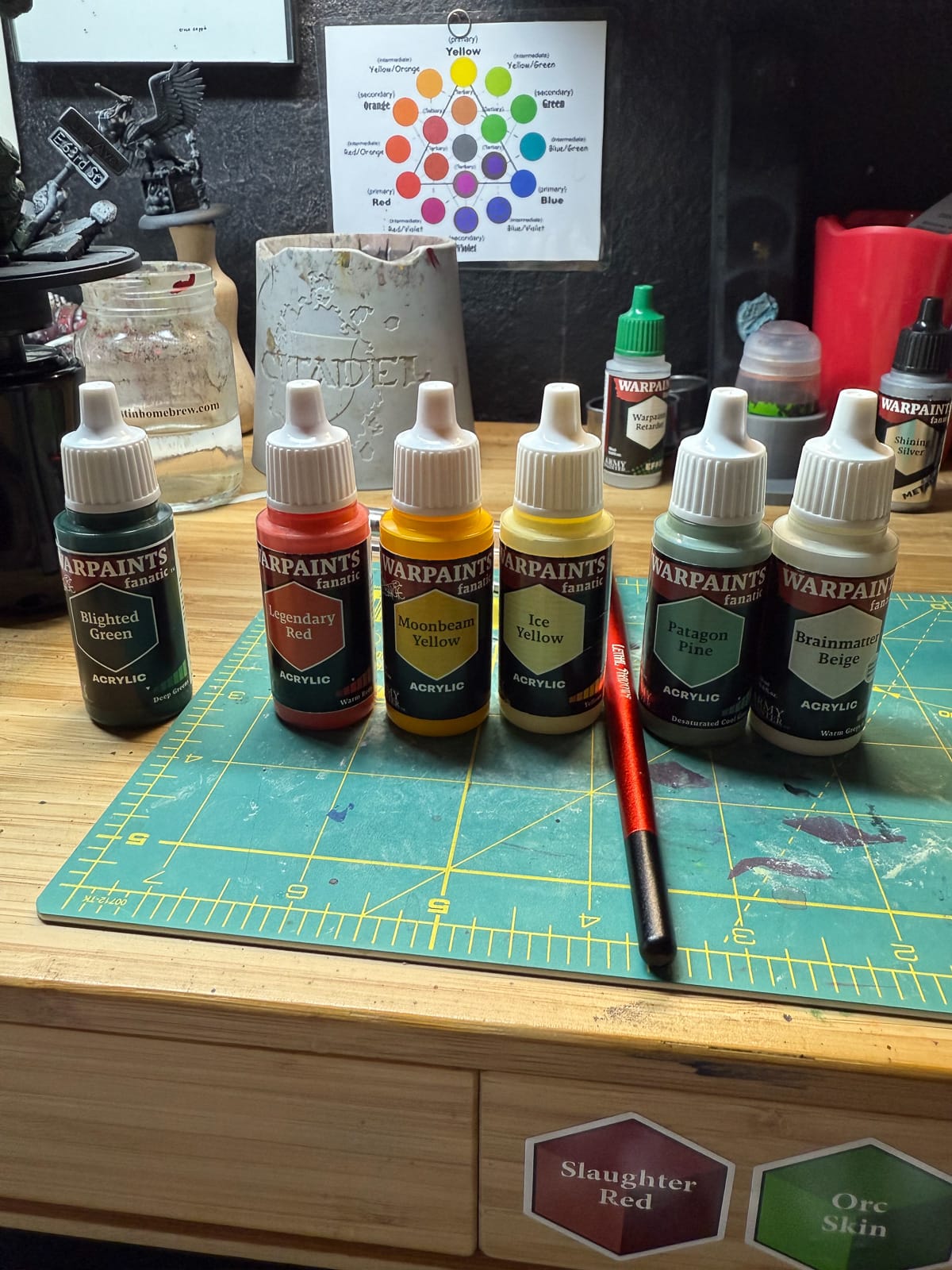 I also used a dry palette at this stage. Modern dry brushing techniques can help you quickly establish a gradient, and on a model like this, it makes setting up all of those tones easy. For ratios, I primarily used 1:1 of each color, with my mid-tones and highlights increasing more of the Pine and Yellow.
