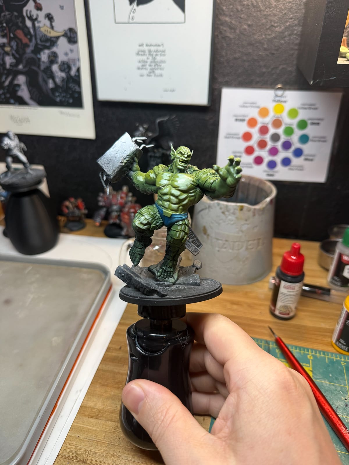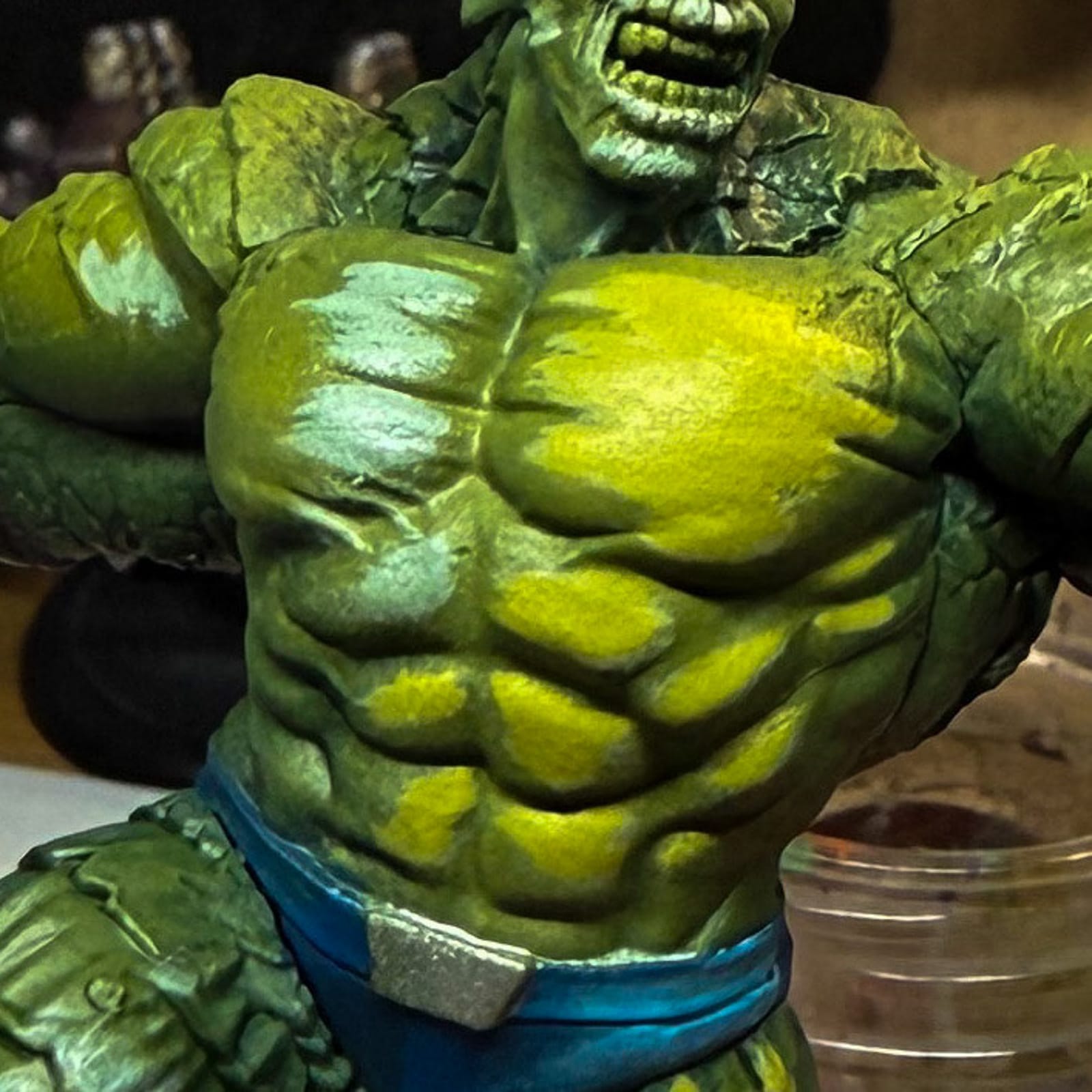 At this point, I realized Abomination needed pants. Keeping it simple, I used The Darkness, Imperial Navy, and Arctic Gem, which was a suitable triad to bring me from a dark green blue to a bright enough color to represent the spandex that I assume Abomination wears. A little bit of Ice Yellow helped establish that final tone, and a mix of Plate Metal Steel and a tiny bit of shade gave me his belt buckle.