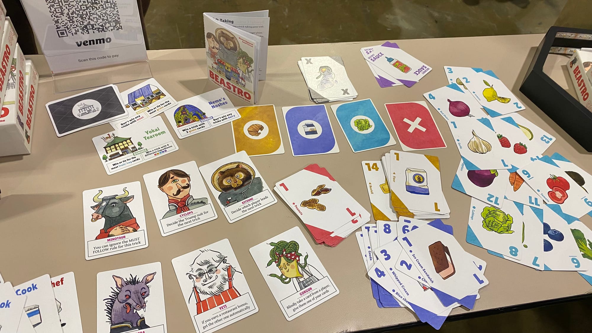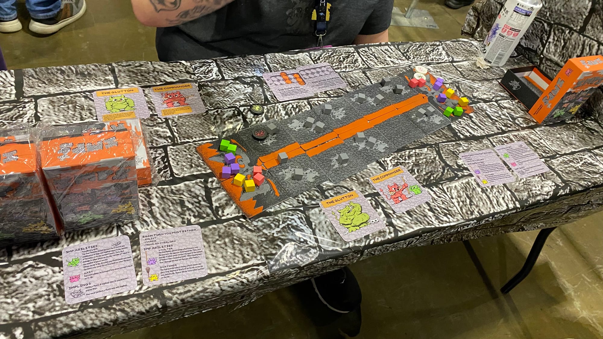 Two that especially stood out to me (and that I was actually able to get copies of) were Imps and Beastro. Imps expands upon the basic mancala mechanic by adding special units and allowing players to grab from any pit and move in either direction. Imps also features a striking bright orange and pale gray palette that looks quite nice on the table. Beastro is a trick-taking game where two teams compete to win the most tricks, but the teams may change each round, and one member of the larger team of Line Cooks is secretly working with the Head Chef. I spoke with one of the designers and found out that his sister drew the charming art, which really sells the game. Beastro is the only one of my purchases I’ve been able to play so far, and it’s definitely a keeper. I would highly encourage anyone to give Beastro a try if more copies are ever made or if a Print-and-Play becomes available.