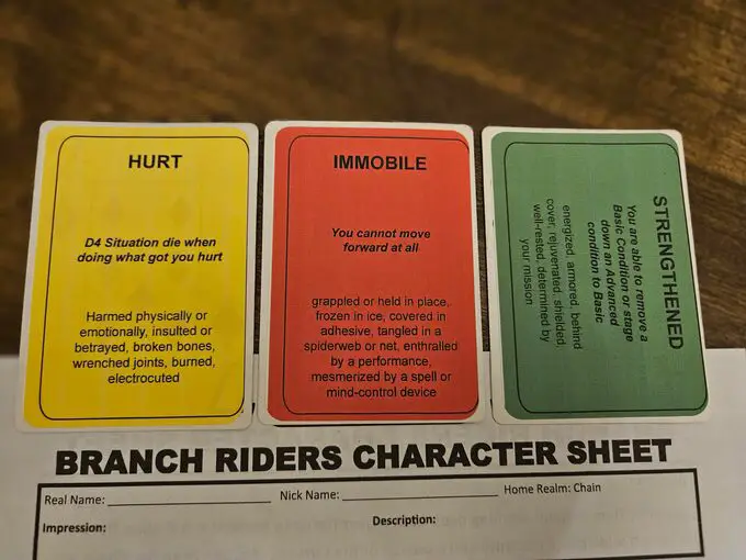 Equipment grant an automatic success where relevant and otherwise trigger a roll. The game doesn’t use hit point, but condition cards for failures or damage. They start at yellow and switch to red if they become more severe. Three red conditions and you are taken out of an encounter until you can heal. Out of everything in Branch Riders, the conditions are the one area I might find room for criticism. The goal is to make them readable across a table, giving the GM a quick view of how everyone is doing. 0-3 cards of a few colors makes sense. The issue comes in with the specificity of those conditions. They vary a lot in triggers and consequences, and can be harder to track when everyone is passing them around. There are also positive conditions gained from in game effects.