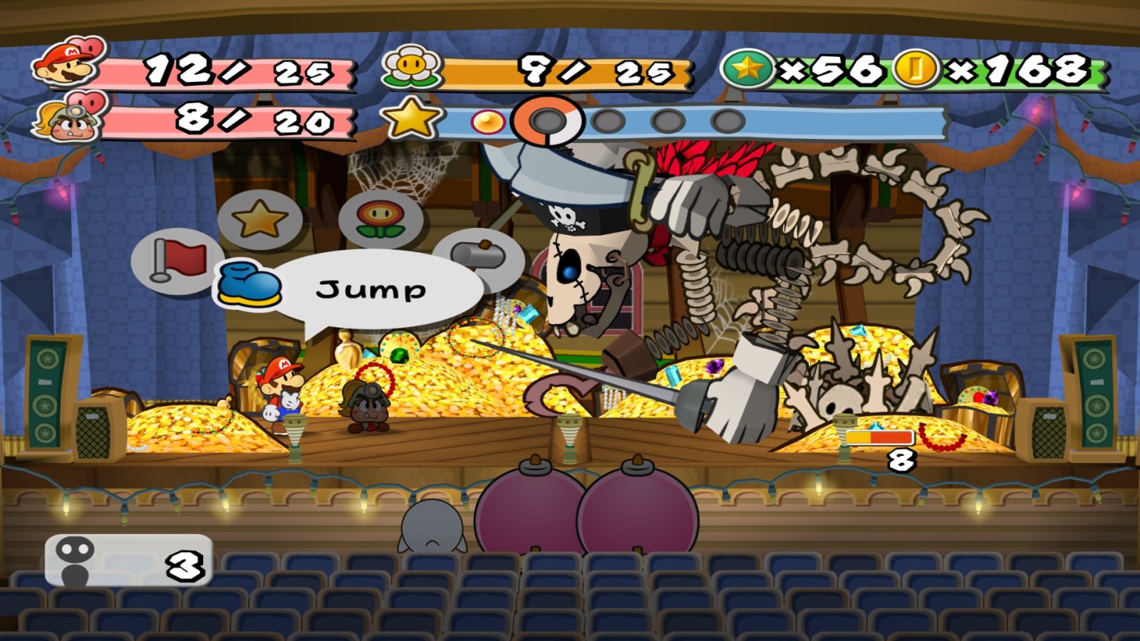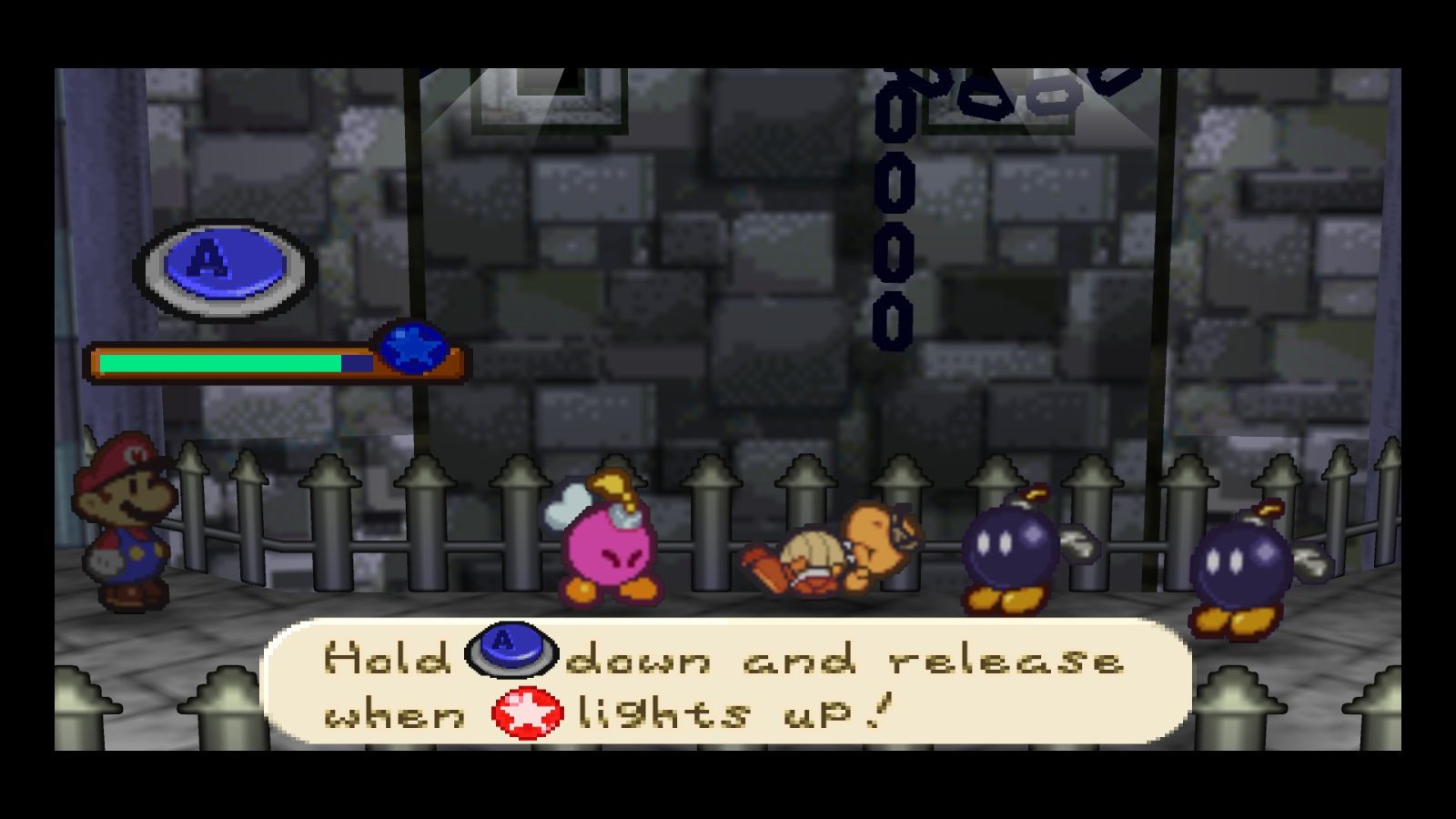 Mario is the star of the show here, but he can share the spotlight with a few friends. Well, one at a time, at least. Partners in battle are essentially specific offshoots of Mario’s repertoire. Your first pal, Goombario, takes jumping to the extreme with headbonks that can hit one enemy multiple times or an entire group of foes one after the other. Kooper, meanwhile, prefers to take the hammer style, able to attack grounded foes without fear of spikes. Each partner has a move or two that makes them unique, like Bombette’s explosions and… whatever Sushie does with her mouth, but that’s the basic gist of partners.