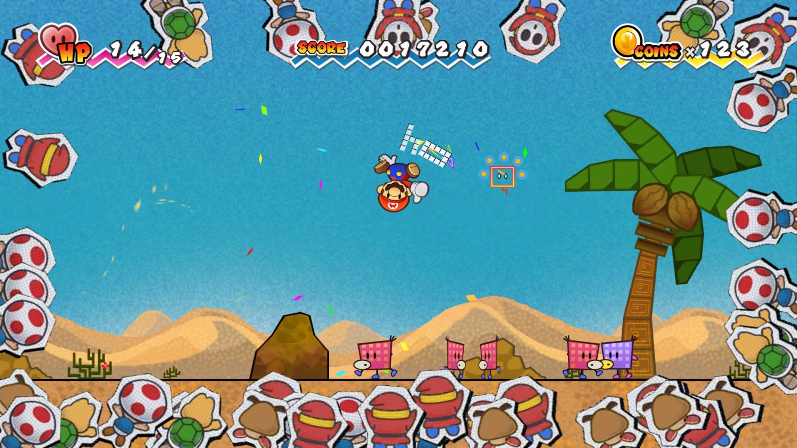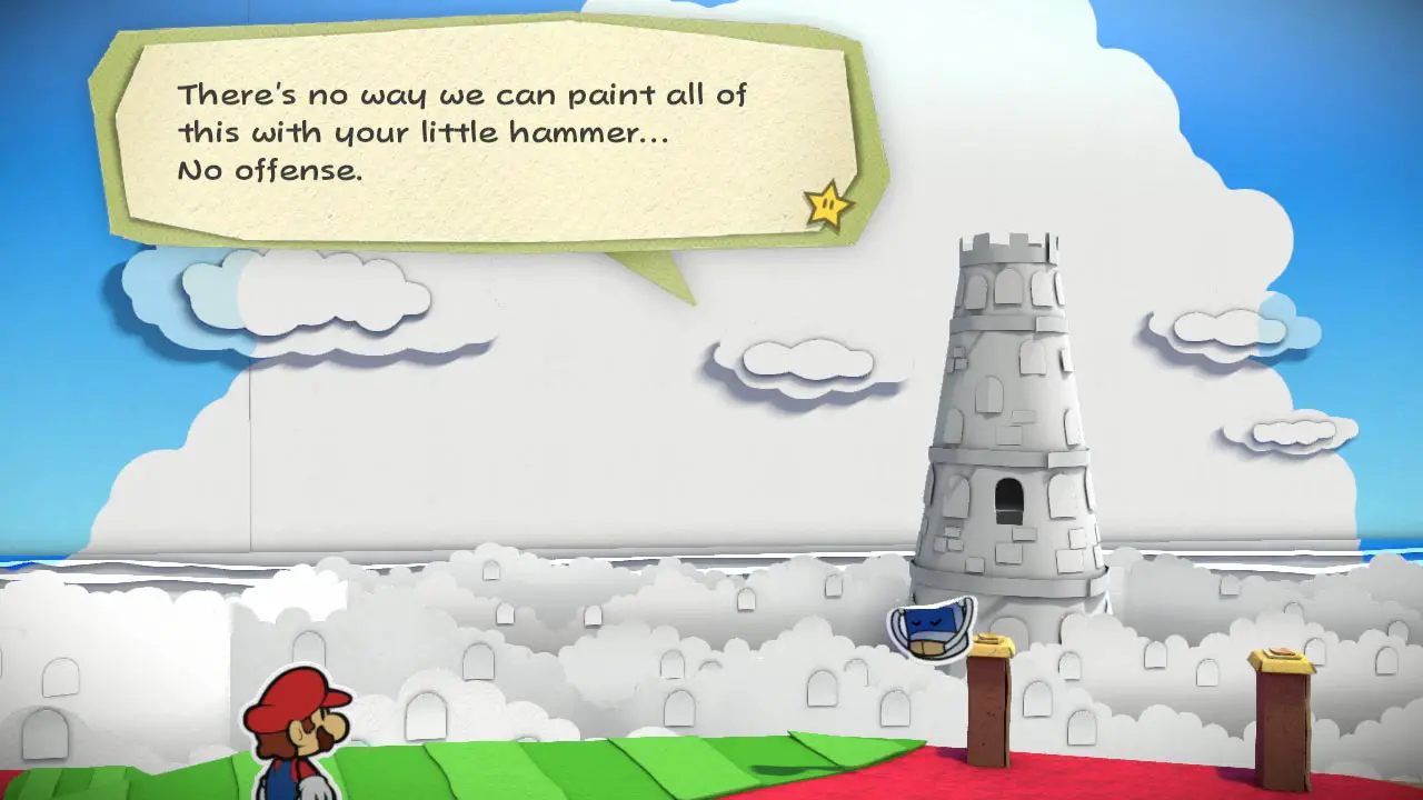 This is where I beg to differ. Despite being the focus of the game, stickers are part of what makes Sticker Star far less engaging than its predecessors. Almost every puzzle in the game comes down to having the right sticker to place in the right spot. Need a windmill to spin? Put a fan sticker on this tree stump. Want to get into the desert? Well you better have a poison mushroom handy to match these hieroglyphics that look exactly like the super mushroom glyph. What? You don’t have one of those things? Well, backtrack through the game and get it.