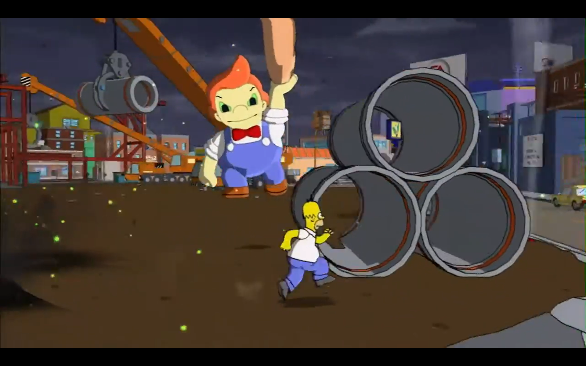 Thankfully, The Simpsons Game contained a quarry full of great ideas and moments we shouldn’t ignore, such as the tutorial level being set inside the Land of Chocolate from the episode “Burns Verkaufen Der Kraftwerk,” which features Homer chasing a white chocolate bunny and disbelieving that white chocolate is real chocolate because “it doesn’t even contain coco salad.” The whole level involves Homer beating milk chocolate rabbits to pieces and scarfing down chocolate while jumping on platforms made of cookie sandwiches, donuts and other delicious confectionaries. Starting out in such a gloriously, chocolatey way brings in a fantastical essence to this Simpsons adventure, an appetizing primer for what unfurls as the story progresses.