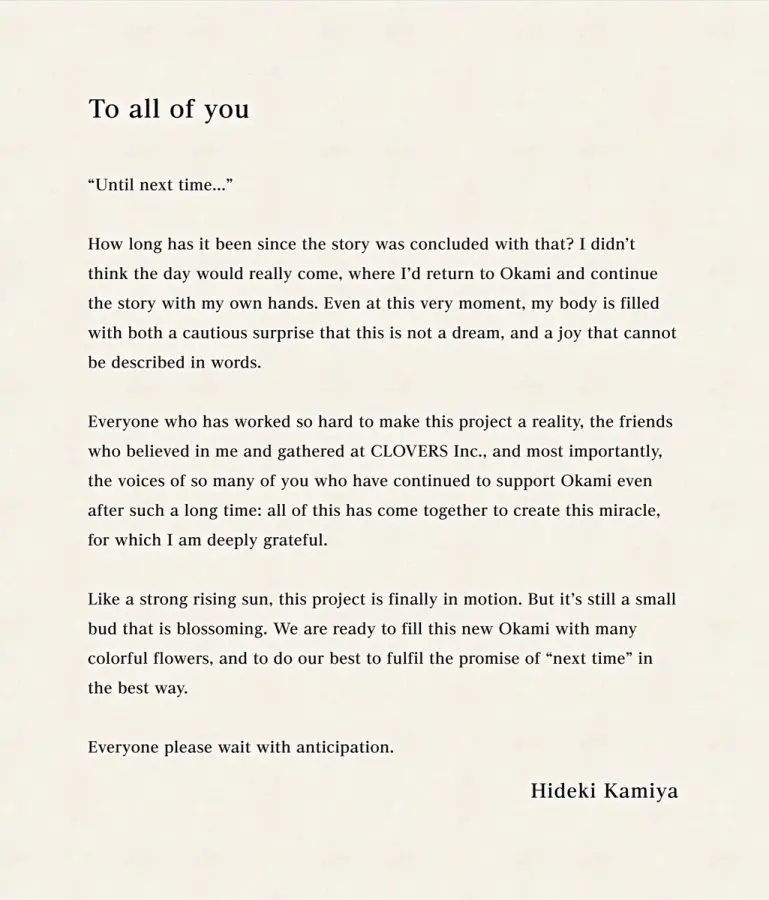 Last night at The Game Awards, Capcom revealed that a sequel to the cult classic Okami is being made. Not much else is known about the project, as the game was revealed with a recreation of the original title’s concept teaser. Hideki Kamiya returns as the game director with the new Clovers Studio, named after the original developers, Clover Studio. Hideki Kamiya also released a special message for fans.