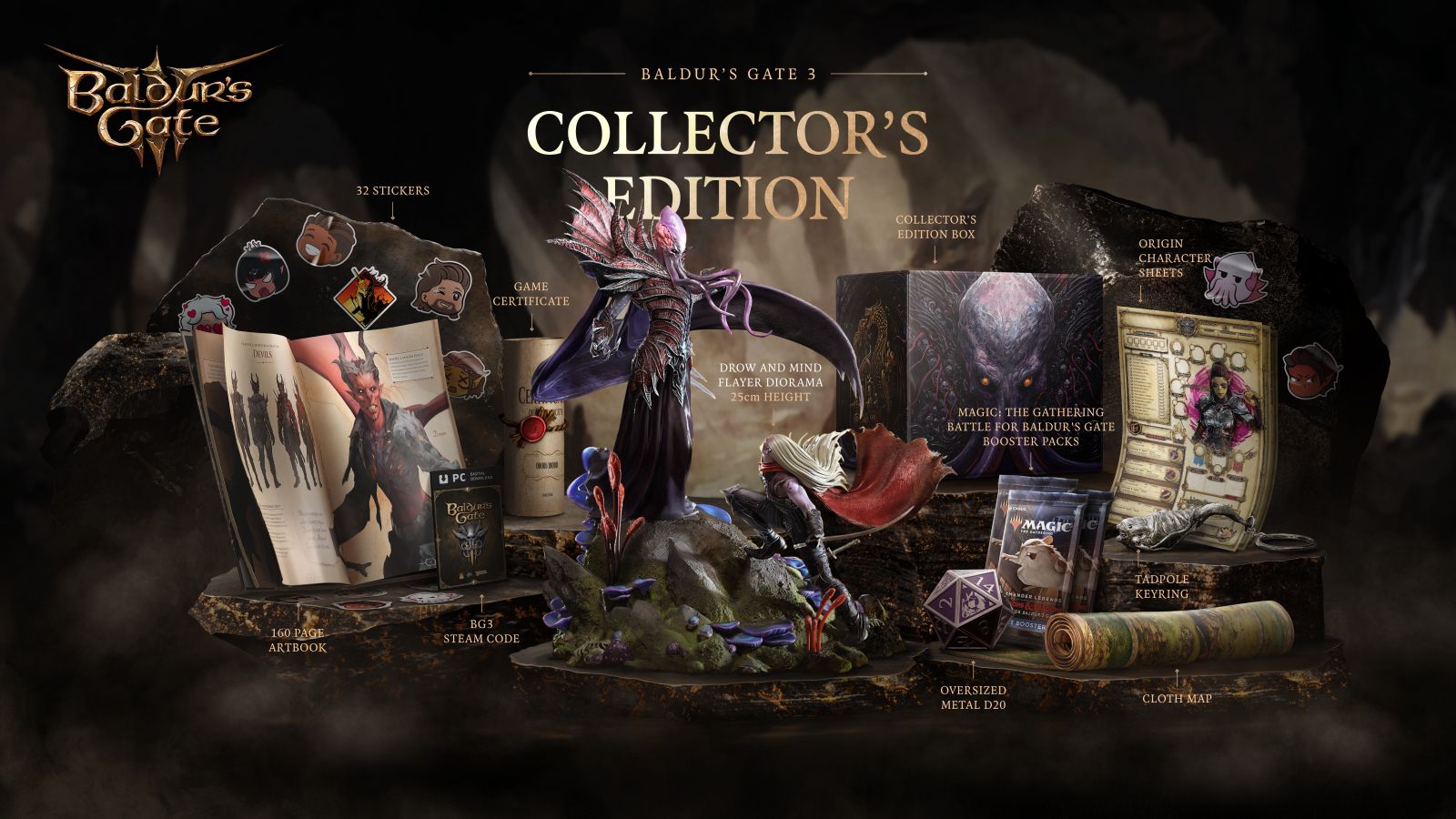- Three Magic: The Gathering booster packs containing the Commander Legends: Battle for Baldur’s Gate card set, featuring characters from Baldur’s Gate 3. (Limited to the first 15k Collector’s Editions sold).