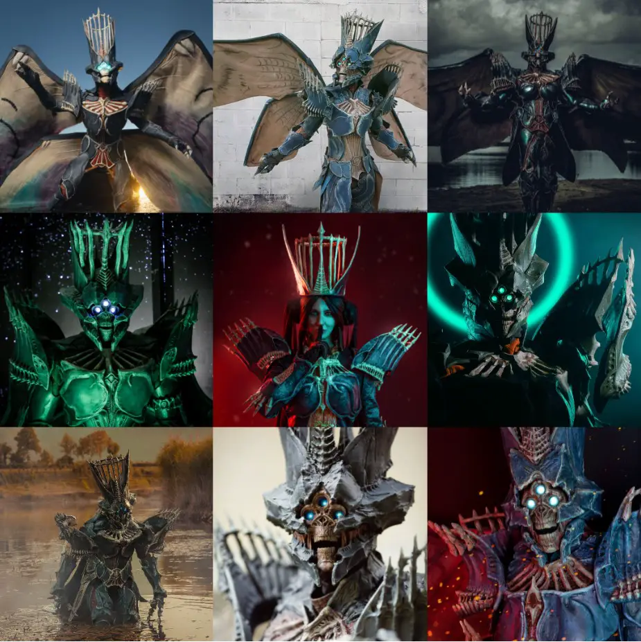 For her take on The Witch Queen, LilyBean wanted to combine the aesthetics of each Guardian class in order to make Savathûn look like a Lightbearer. Elements from each class, including Savathun’s Krill appearance as Sathona, were incorporated into a design that stayed similar to the in-game look while being unique to LilyBean’s vision. The head features spikes that were shaped and painted in reference to the Crown of Tempests helmet, as well as engravings on the mandibles that transform the face into an homage to the Mask of the Third Man. The breastplate was reshaped to appear similar to a Titan’s, and a Warlock-style bond was designed for the left arm, fitted with Hive runes and Savathun’s insignia.