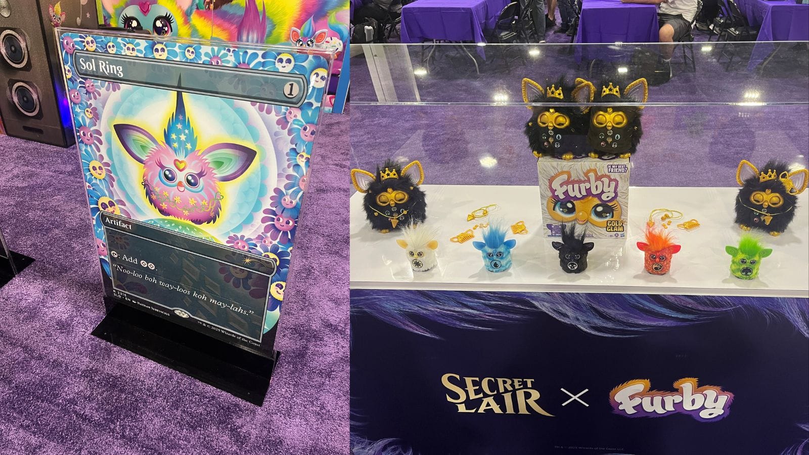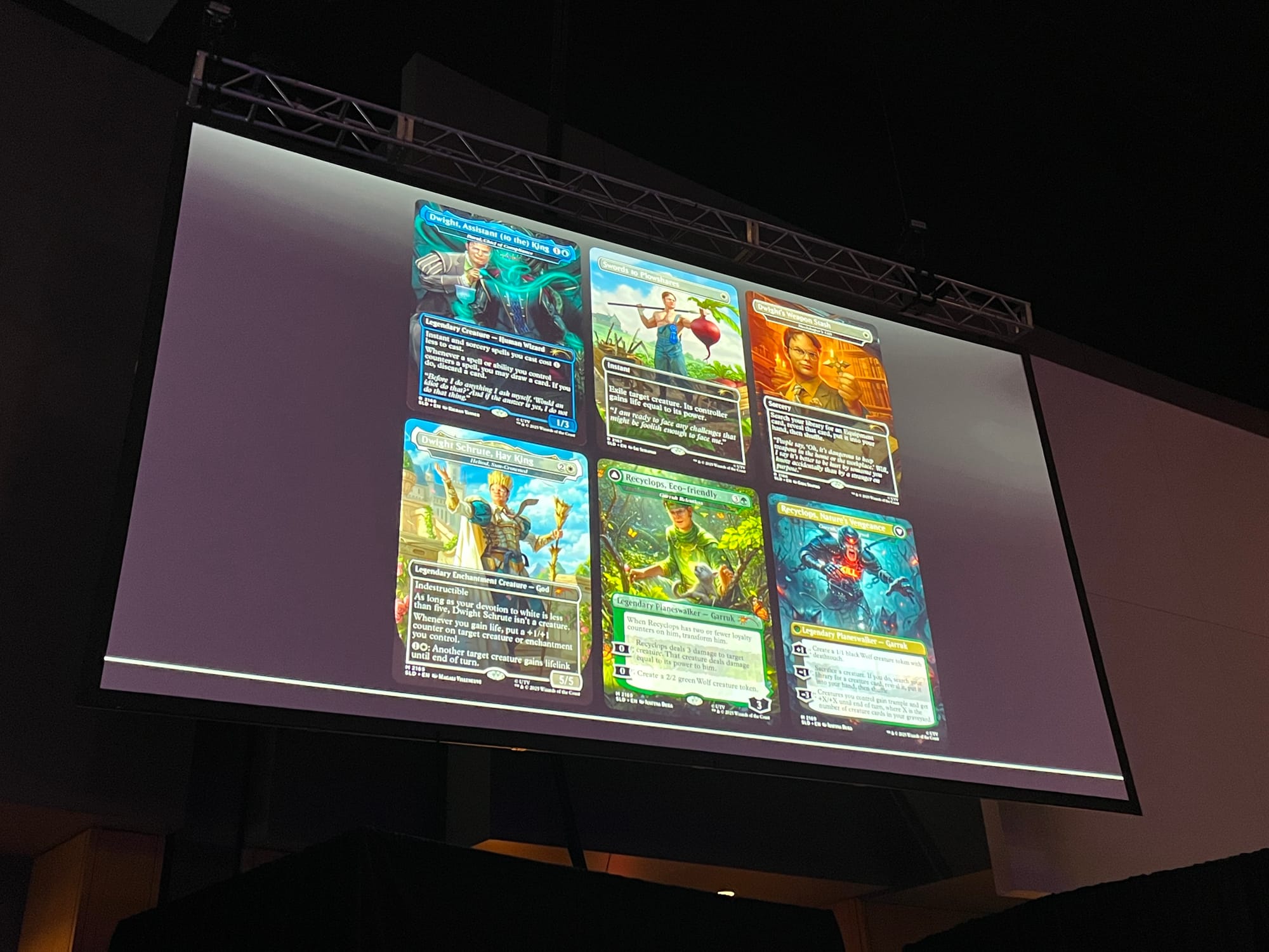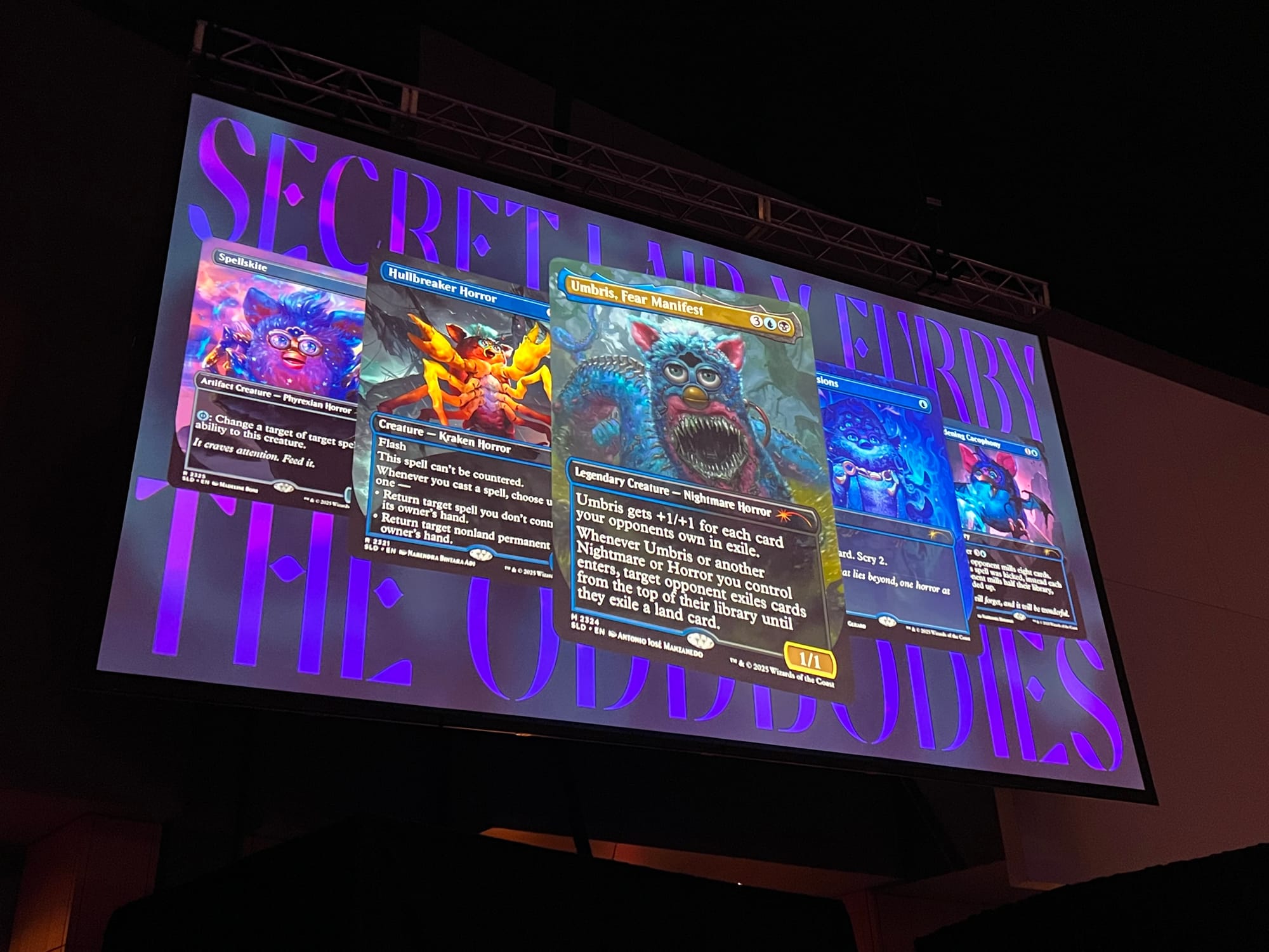 The Secret Lair panel was shortly after, as the Secret Lair team did a fabulous job of showcasing their next Superdrop with everything from The Office to Sony and even a large Furby set coming over the next few months. The crowd, while not as big as the Preview Panel, was extremely excited and sometimes louder than the Preview Panel crowd when they saw something they liked. Oh, and that covered area I spoke of earlier? After the Secret Lair panel, it was revealed to be a Furby-themed dance area with giant glass versions of some of the Furby collab cards as well as some iconic Furby looks.