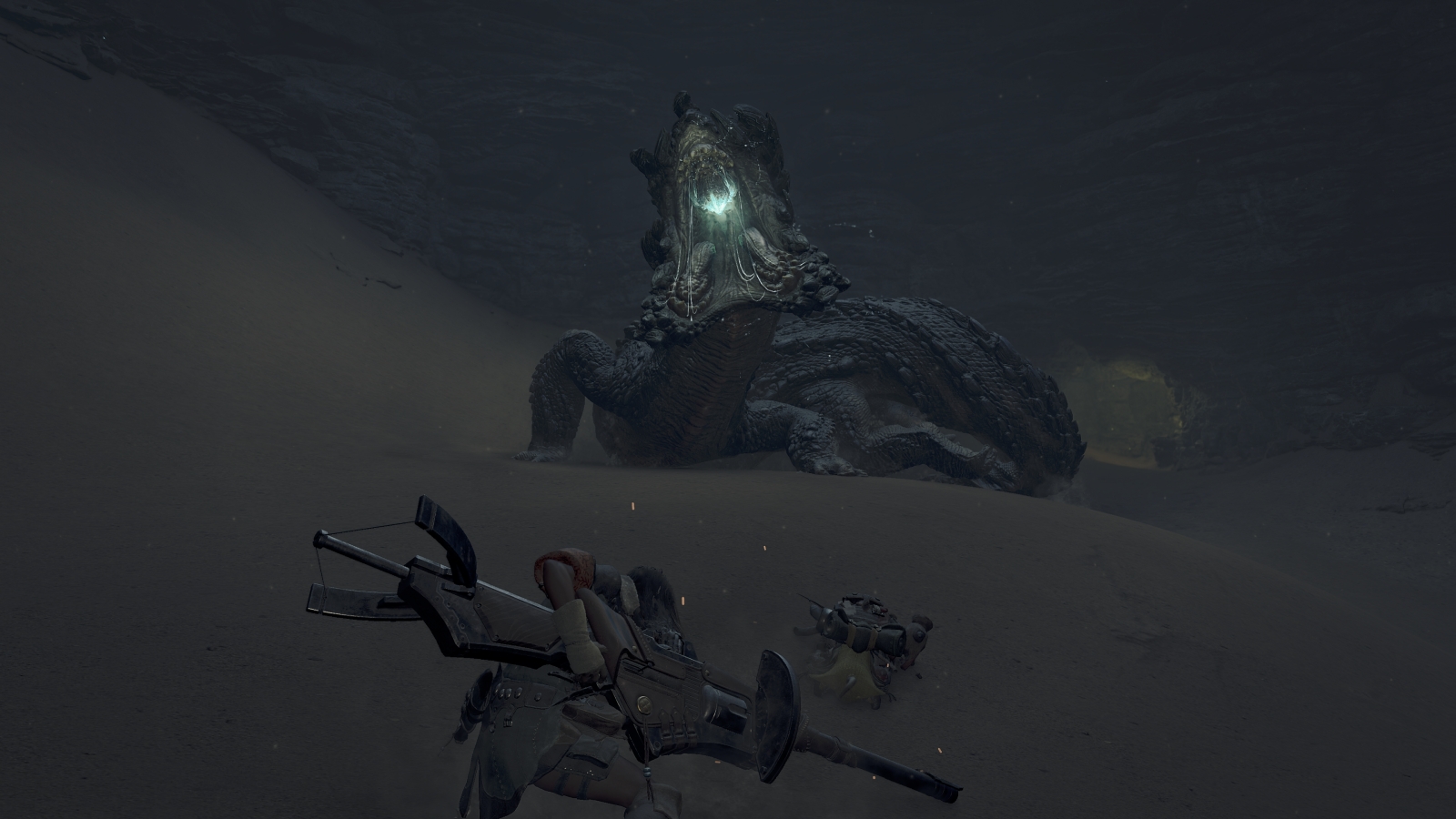 Maneuvering the Doshaguma near a sand pit attracted the nearby Balahara, who was more than happy to coil itself around the Alpha Doshaguma. The battle that ensued was a cacophony of lightning strikes, screeching, monsters flailing about, and us occasionally zipping in for an opportunity attack to help finish the job. Ultimately, the Balahara pulled the Doshaguma down into the quicksand, taking care of my hunt for me and leaving me with some loot for my efforts. We are told that the world is filled with such opportunities, just waiting for the player to uncover them. If we did encounter a foe that we were struggling to take down, the returning SOS Flare mechanic would allow you to request help from other hunters, but it does bring me to the one thing that I found supremely disappointing.