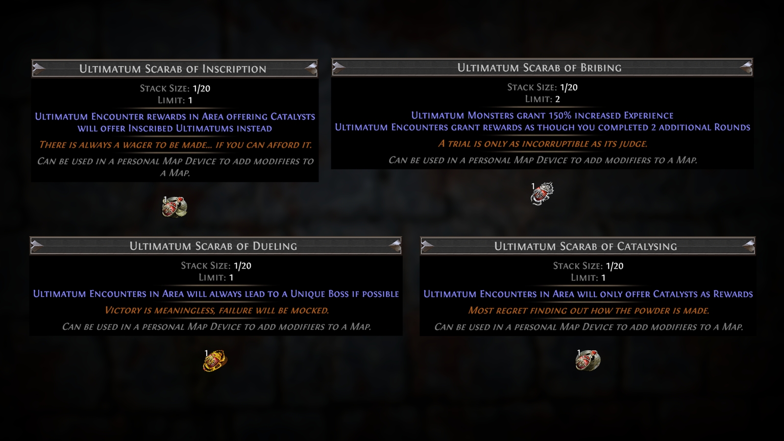Endgame players will find an entirely new system upon their return. Replacing the Sextant and Master Selector are Scarabs. These Scarabs now have multiple versions that you can invest in to experience precisely the content you wish. Stacking up to 20 of them, you can modify the map greatly, allowing you to more efficiently run the map for maximum rewards.