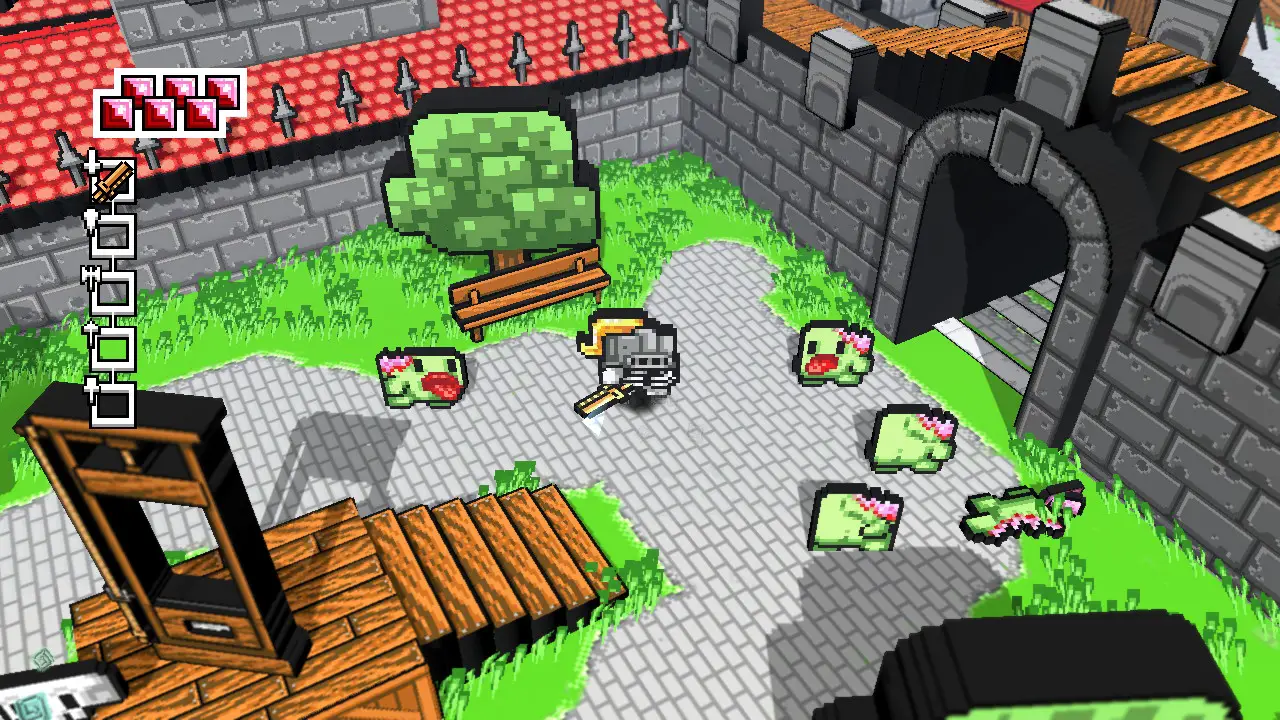 First off, I want to commend developer Umaiki Games on how beautiful the game looks. The distinctive voxel 3D style works perfectly for a game such as Skellboy, and it has this goofy atmosphere in a fantasy setting that I quite enjoyed. Whether enemies are blown to pixelated chunks or you start swinging a sword around, the game looks adorable. There is a lot of detail poured into the art style, and everything looks great. The game also has a legitimately addictive chiptune soundtrack which works perfectly with the title. However, while the presentation looks spot-on and wonderful, the technical performance doesn’t hold a candle. While Skellboy is playable in both handheld and docked modes, the frame rate has some extended periods where it feels choppy.