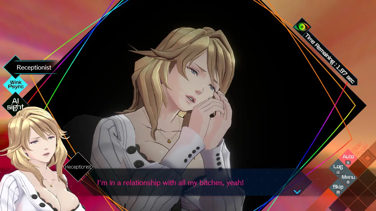 If that wasn’t an indication, Somnium Files is just about as hilarious as it is dark. Recurring gags like not being able to remember Kagami’s name or Tama and Aiba being obsessed with a receptionist’s huge breasts are back in full force here, along with a ton of other new puns and jokes throughout the game. The humor doesn’t punch down either, there are multiple LGBTQ+ characters such as Mama who actually manages to make funny jokes about trans people. What a concept! The humor helps endear you to each of the wacky characters and learn more about who they are, what their goals are, and eventually how to solve their Somnium.