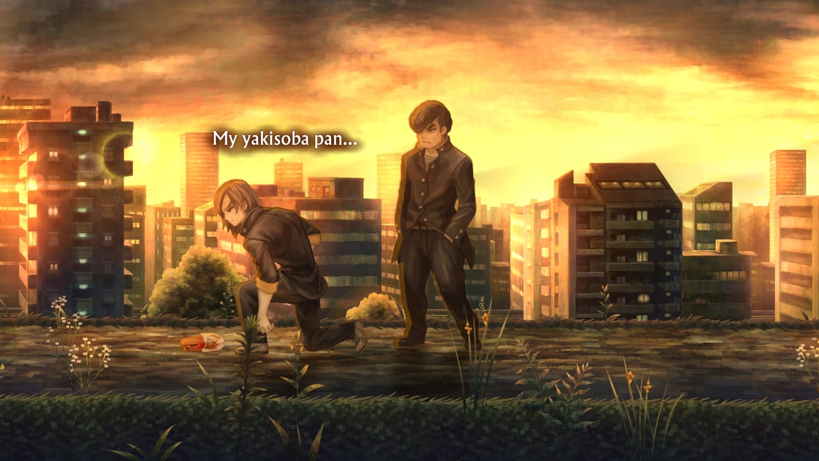 In Reminisce, you’ll choose from one of the protagonists, who are all highschool students in a Japanese city, and play through a bit of their story in an adventure game style. I don’t want to go too deep into what exactly you do in this mode, so as not to spoil the excellent plot, but essentially you’ll walk around an environment, interact with people and objects, and use/think about ideas in your character’s “Thought Cloud,” which is basically your inventory. Most characters’ stories follow a similar structure of starting in one place every single time, for example Iori Fuyusaka will always start in the middle of the city deciding what to do with her friends. From there, you need to do different things, like going to get the delicious looking crepes instead of soft serve, to access different parts of the flow chart and progress the story. I found that the most interesting and fun characters to play as are Nenji Ogata, who’s stuck in a time loop a few minutes before aliens invade, Natsuno Minami, a sci-fi nerd helping a cute little robot find something across time and space, and Juro Kurabe, arguably the main character, who’s a Kaiju film buff investigating his strange dreams. Every story throws Earth shattering developments at you constantly, but these three stuck out to me because they changed up the context of the gameplay just enough to feel fresh and exciting.
