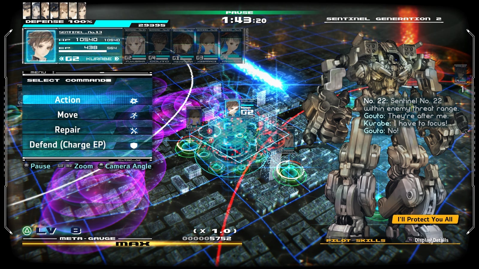 Destruction mode takes place after the events of Reminisce and features real-time strategy gameplay as you guide the protagonists, now piloting their titular Sentinels, to defend the city from aliens. Each area contains about 10 stages, where the goal is usually to defend a point until time runs out or all the Kaiju are defeated. While the characters’ giant robots are divided into four distinct classes, melee, all-rounder, flying, and ranged, they each have skills and abilities that make them unique. For example, Ryoko Shinonome has a passive ability where she becomes more effective when fighting by herself away from the other protagonists. Because of these traits, you may want to choose a certain character over another for some battles even if they’re of the same class. You can only bring six combatants into battle, but some levels have restrictions which will grant you bonuses if completed like bringing certain characters or only having four participants in battle. You can further increase your score by choosing not to recover between battles, which keeps characters’ HP, EP, and Brain Overload status consistent between fights. While you can easily recover HP and EP in the midst of battle, piloting a Sentinel too much takes its toll on a character, and if they reach Brain Overload they won’t be able to participate in battle for a while.