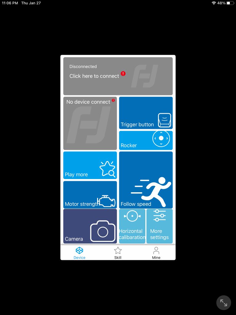 Also inside this panel you can do things like disable the selfie mode, calibrate your various axis rotations, disable the sound for silent operations, increase or decrease motor power or follow speed, or even use some handy presets that might help you if you are new to gimbals.