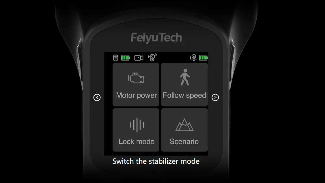 On the rear of the rear grip handle is a 1.3” touch screen. Like the touchscreen on the AK2000, this provides controls for the device, and when connected to a compatible camera with the included cables, it can even control the camera itself. This is handy as it’ll allow you to focus on getting the shot without taking your hands off the gimbal. A small thumbstick gives you additional control, just as it did on the AK2000, but here it’s in a far better position than its predecessor. Let’s get into the software of the Scorp.