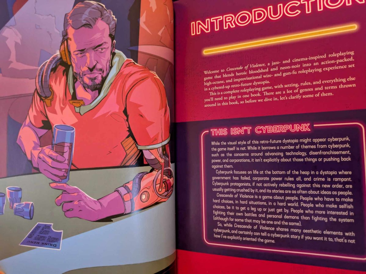 The full title is Crescendo of Violence: A Neon-Noir Roleplaying Game, and the book starts with a lengthy discussion of genre and this game’s place within genre. Not to be confused with cynical mystery revival neo-noir, neon noir is characterized by…being more colorful? There are many pages of discussion and good critical quotes about noir, but it all ends up talking about what CoV isn’t, as opposed to what it is. Genre is a sticky subject; it’s a series of categories, but too strict adherence to category limits discussion into drawing pointless lines and talking about which side certain things are on. For instance, there is no real substance to the question of whether Avatar: the Last Airbender is an anime or not. It doesn’t really matter, and you have to be pretty stupid to bother arguing about the subject in the first place. You might as well get into a fistfight over whether a hotdog is a sandwich. It’s an exercise in semantics that doesn’t change anything about the actual experience unless you really want it to.