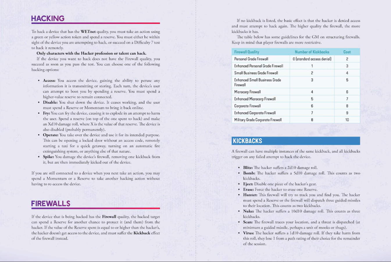 At the end of the day, there is one real mechanic that governs everything, the basic d10 vs. difficulty roll. Reserve and Momentum offer minor modifications, and Hacking gives you something else to do, but none of those serve to create a variety of feelings during gameplay. It’s certainly quick to learn and use, which facilitates general of action, but not the kind of fluid violence that seems to be the real, intended goal. In play it does move quickly, but not in a way that I felt conveyed a sense of genre or tone. Just a series of rolls which vary in difficulty as you trade resources around. You do have some choices to make, but they are rarely ones that are all that hard: do you use the scant resources at your disposal to your benefit or not? When do you give yourself the occasional disadvantages?