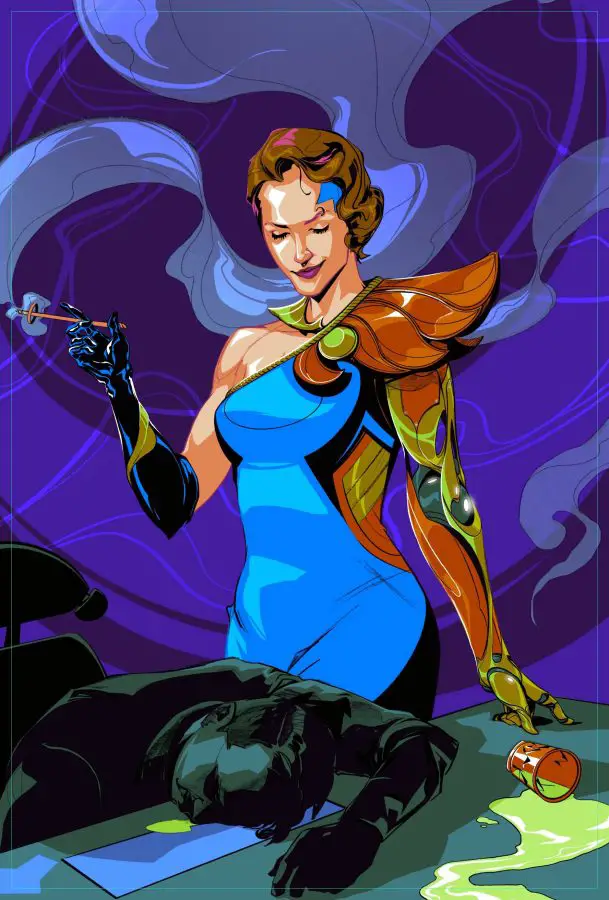 That all said, the presentation is generally nice. The neon pages are replete with art selling a very cyberpunk New Orleans, tommy guns and trumpets beating out their tones against a dark sky lit with flying police cruisers filtered through the rain. It’s got a style I would love to see more of, in any medium that can take it. The book is small enough to carry without issue but has a good hard cover and thick pages that will let it survive whatever carrying bag you decide for it. The text rarely fills its pages, and comes with a small font, making me wish someone had increased the size across the board. With such empty space on the pages in a small book, it would have made it much more readable.