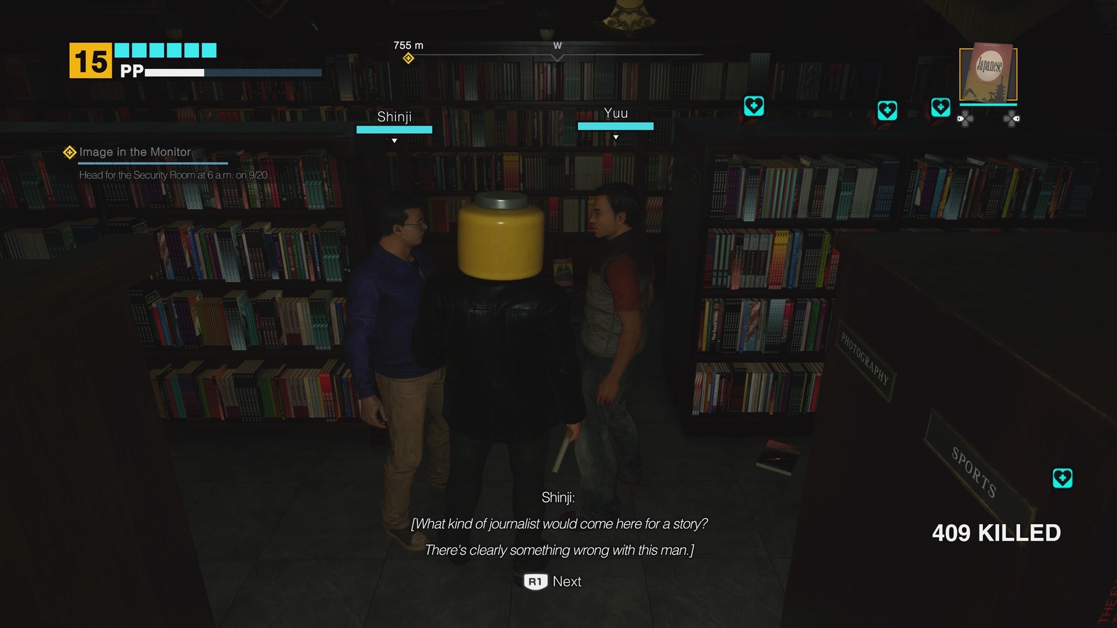 The zombies (and other enemies introduced later in the game) force the player to become savvy about how they traverse the mall. Dead Rising provides a lot of freedom, but the most interesting uses of it tend to be in the name of efficiency. Detours may take longer, yet will expose you to less hazards. Intrepid exploration and dutiful mission completion will reveal hidden shortcuts. Pros will take note of which items can be found where and then create paths through the game that keep them stocked up on the right tools for each job. A strong combination of weapons, health items, and effect-giving books can turn a nightmare scenario into a comfortable, if gruesome, daydream.