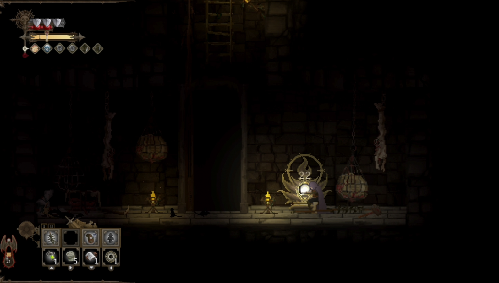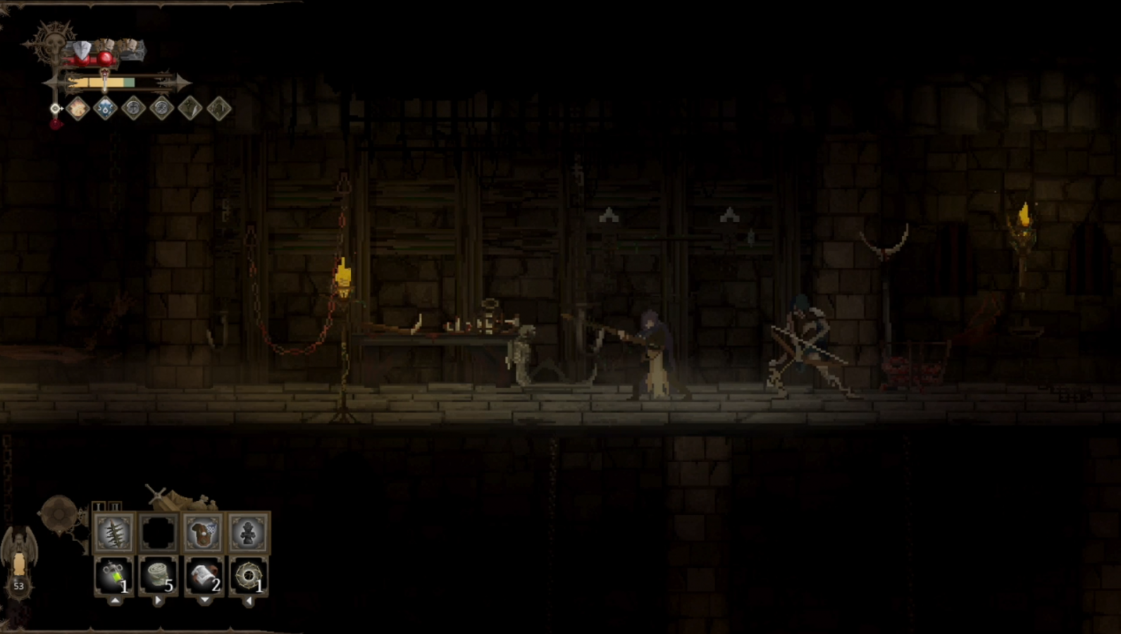 Dark Devotion is a 2D action game that focuses on combat and exploration. As mentioned before, you play as a Templar who has decided to journey through the fallen Temple. At first, you only have your faith and fists, but you can obtain a starting sword and shield from the blacksmith in the hub area. As you explore the 2D world, you’ll obtain various weapons and consumables from enemies, chests, some corpses, and special statues. You have two loadouts at any time, which allows you to carry two different weapons at the same time. You can swap between them with the press of a button, which is extremely helpful if you have weapons designed for certain situations. For example, you may have a broadsword in one loadout and a bow and arrow in the other. You’ll still have to pick and choose what to take with you, but at least you aren’t limited to only one weapon. Plus, you’ll have access to weapons such as broadswords, bows and arrows, maces, cudgels, claws, spears, spellbooks, and more.
