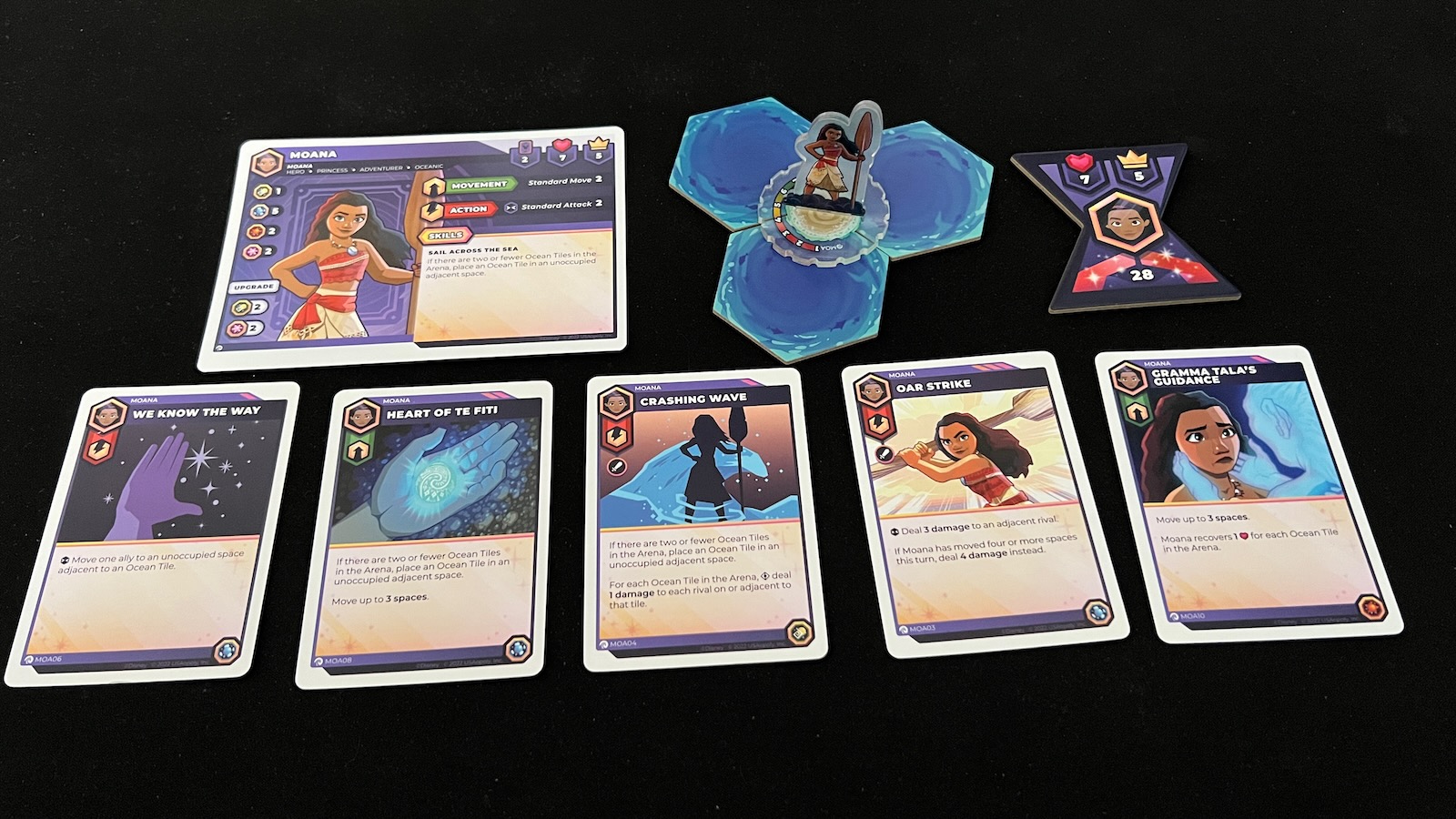Moana employs an ability to put out water tiles on the board for her and her fellow oceanic teammates to use. When moving through a water tile, oceanic characters get an extra space of movement across the board. This can really move a character across the board when you have all three available tiles lined up. When upgraded, Moana can rearrange the top two cards of her deck. Moana’s deck relies on having ocean tiles on the board and optimizes attacks, healing, and movement when they are on the board. Having other oceanic allies use the tiles can slow her down a bit if certain cards enter the fray.