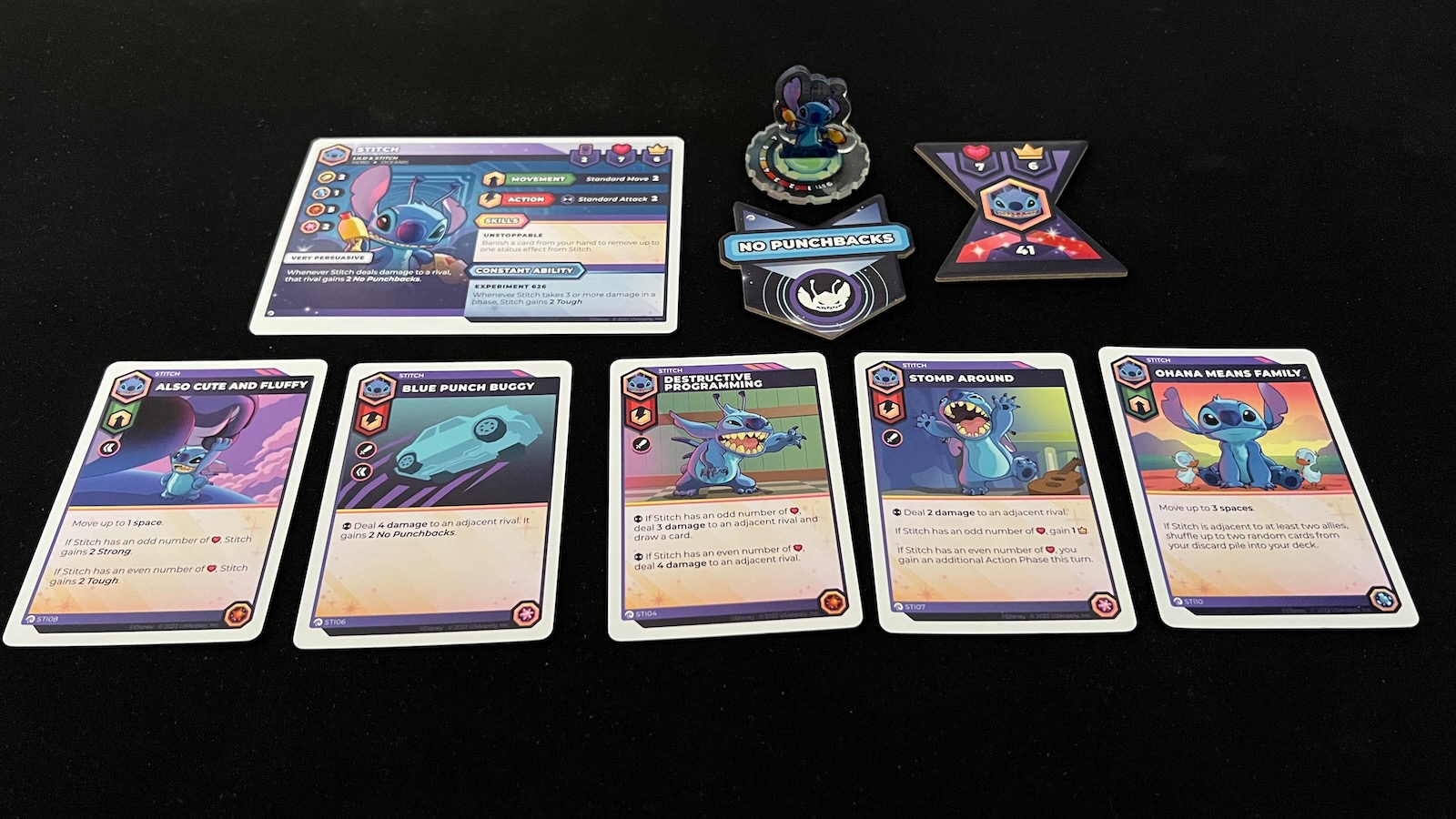Stitch is kind of wild and all over the place. He gets powered up by damage and has a special ability to discard cards to remove status effects. When upgraded, and when using some card abilities, Stitch is able to assign a new “No Punchbacks” effect, essentially stopping a damaged character from being able to retaliate. A lot of Stitch’s cards have varying effects depending on the amount of damage he deals or the number of hearts he has. These varying effects are reminiscent of the craziness of the character in the movie.