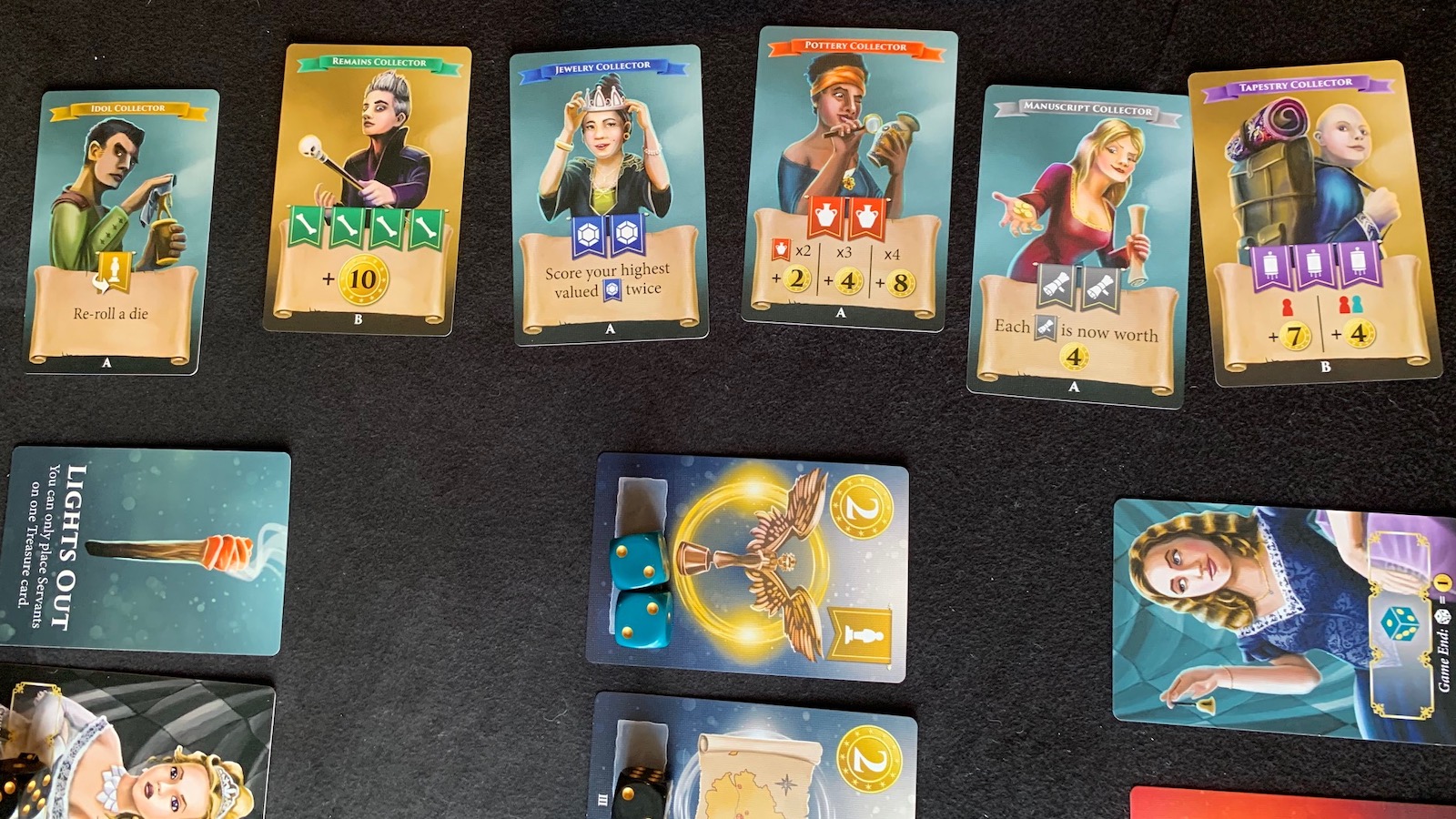 Mostly that’s how you play the game, simple and easy. You do this until the treasures run out, then the winner is the player who ends up with the most valuable collection of treasures. Deciding which treasure you want can be tough though, as 1 or 2 of the cards available to bid on are face down showing only their type, and there are 6 collectors to the side who offer you benefits for collecting their type. Depending on what you collect, you can reference the collector cards and make each treasure worth more points at the end, make sets of treasures worth more, or take immediate actions such as recovering or retooling dice. The immediate actions require you to flip the cards of that type over, showing that this option is finite based on how many of these type of treasures you’ve acquired.