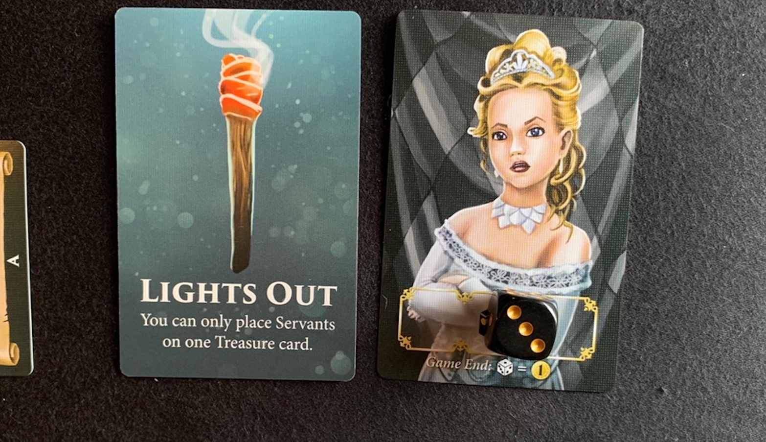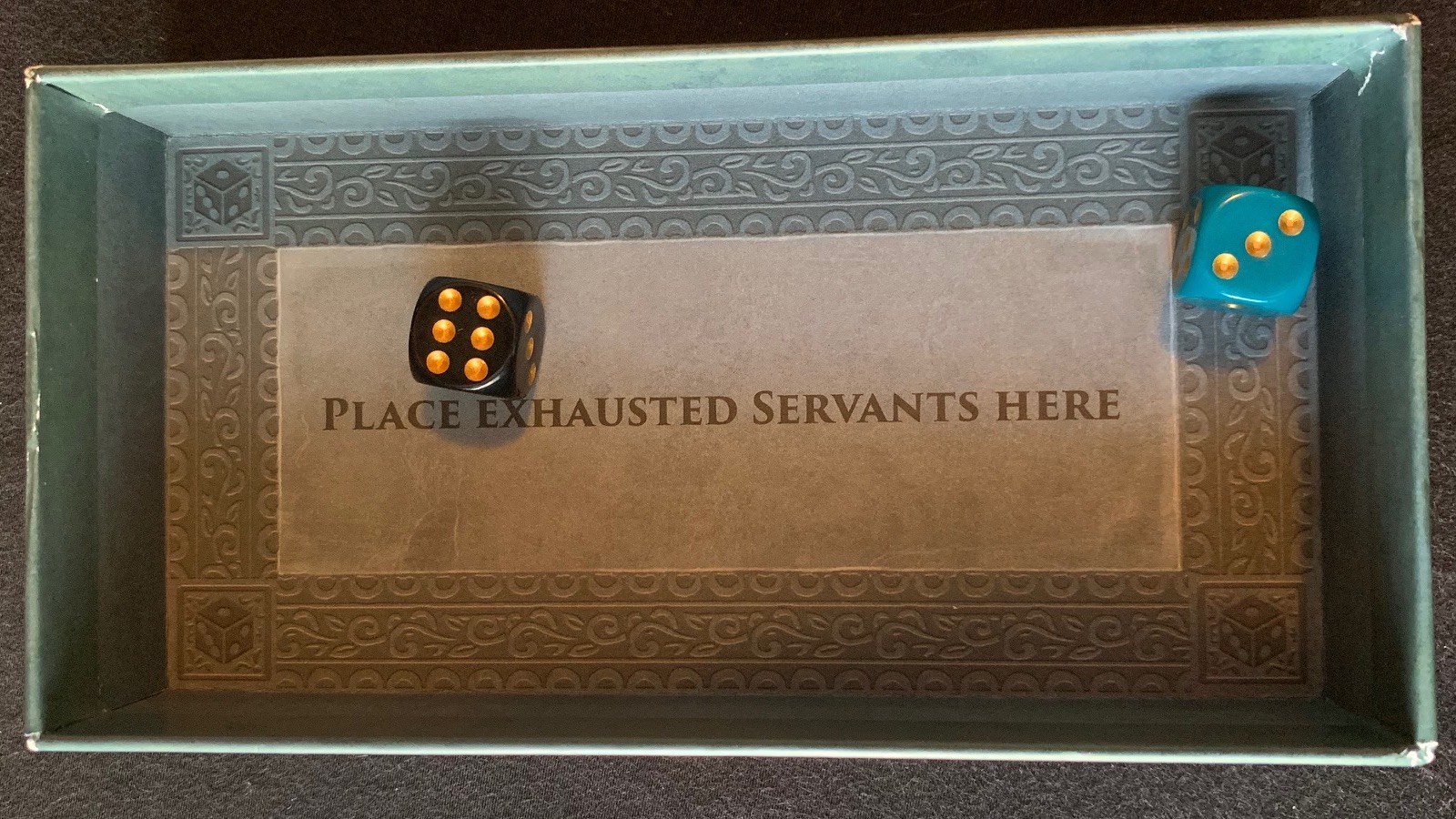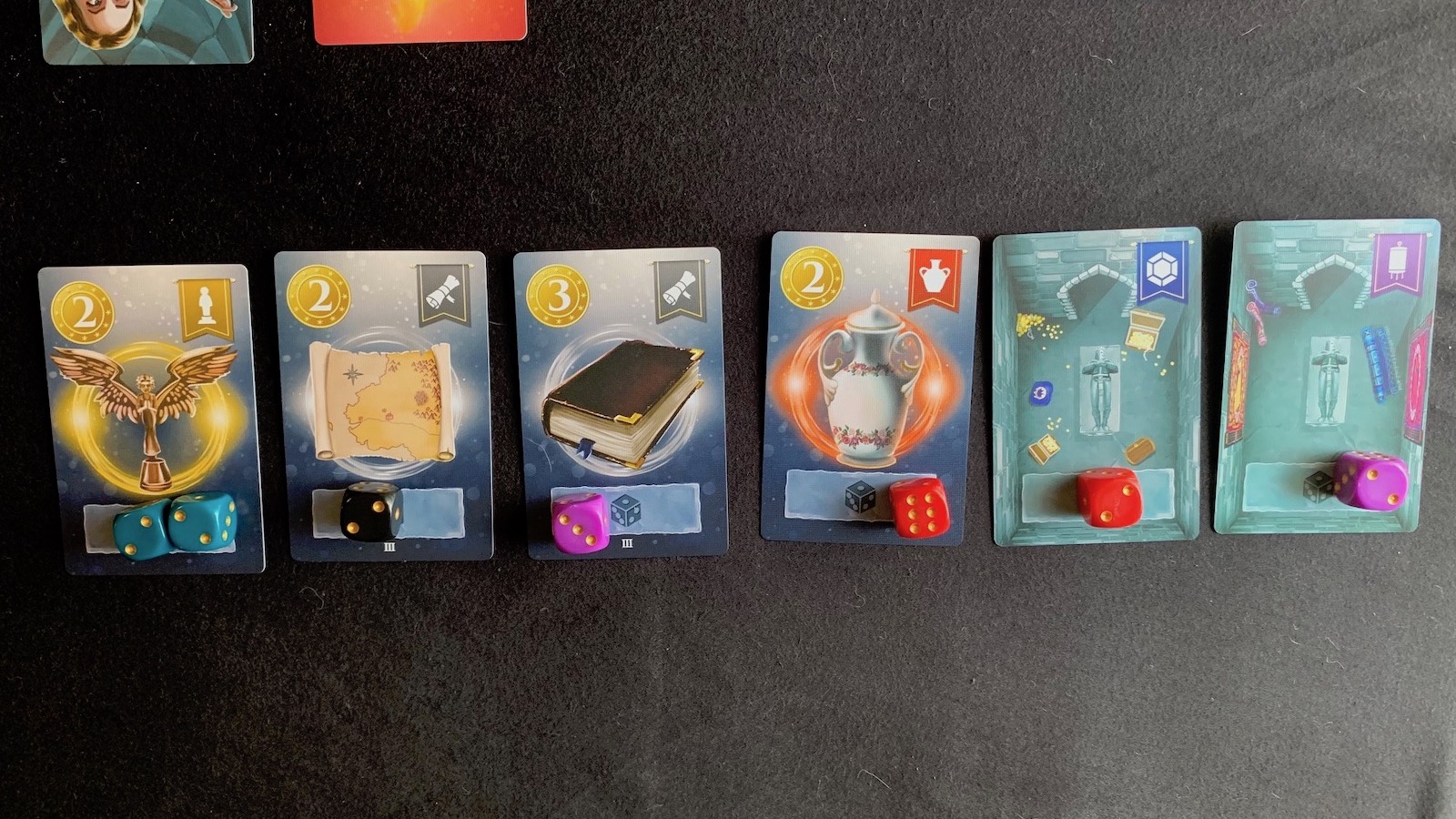 The players then choose which treasures they want and bid on them, sending their dice (servants) to the cards to represent their bid; the higher number beats the lower number, and each player decides what number their dice will have on them. All of a player’s dice can be placed on the same card or spread out across multiple cards, but if they are on the same card they must have matching values. That is, if you play 2 dice on a single treasure, they must both have the same number showing, but the total added together counts as your bid. This matters because even though you do want to bid high, once you win the bid, all of the winning dice on that card are rolled. If the value rolled doesn’t match or exceed the value bid, those dice are “exhausted” and put in the top of the box designated for that. Exhausted dice can’t be used again until the player uses a future turn to reclaim them. Therefore using 2 dice each with a 3 on them is less risky than using one with a 6, but it lets you bid on fewer cards.