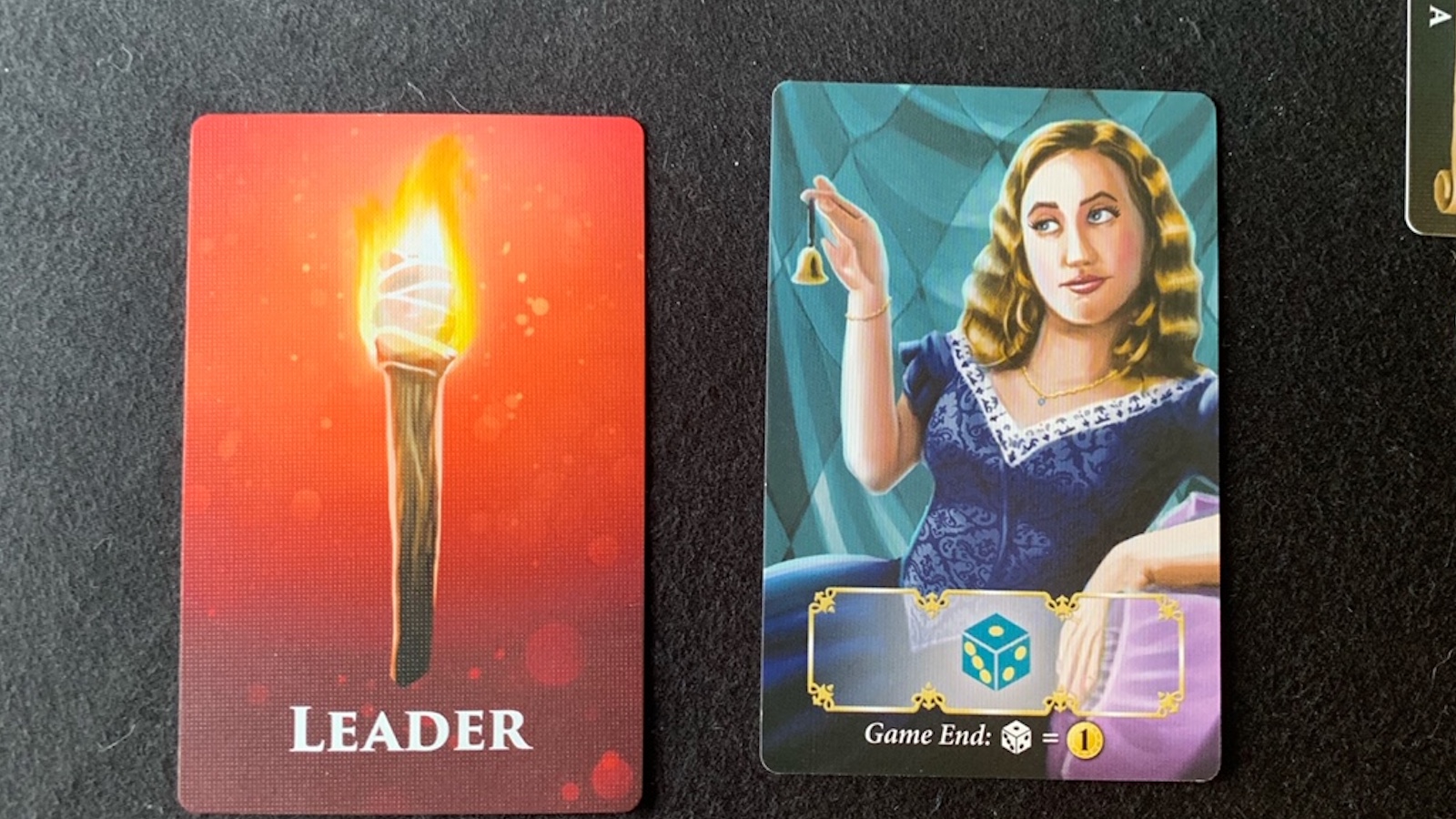 Each player in turn gets a chance to outbid each other, bumping the dice of anyone they outbid, and returning them to their owner. The last person (signified by the “lights out” torch card) has the advantage of bidding last with no one behind them to bump them, and because of this advantage they only get to bid on one treasure. Players then take the cards they earned placing them face down in front of them organized by type, and take back their dice they used to do it. Then they pass the first and last player torch cards to the left and start the next round.