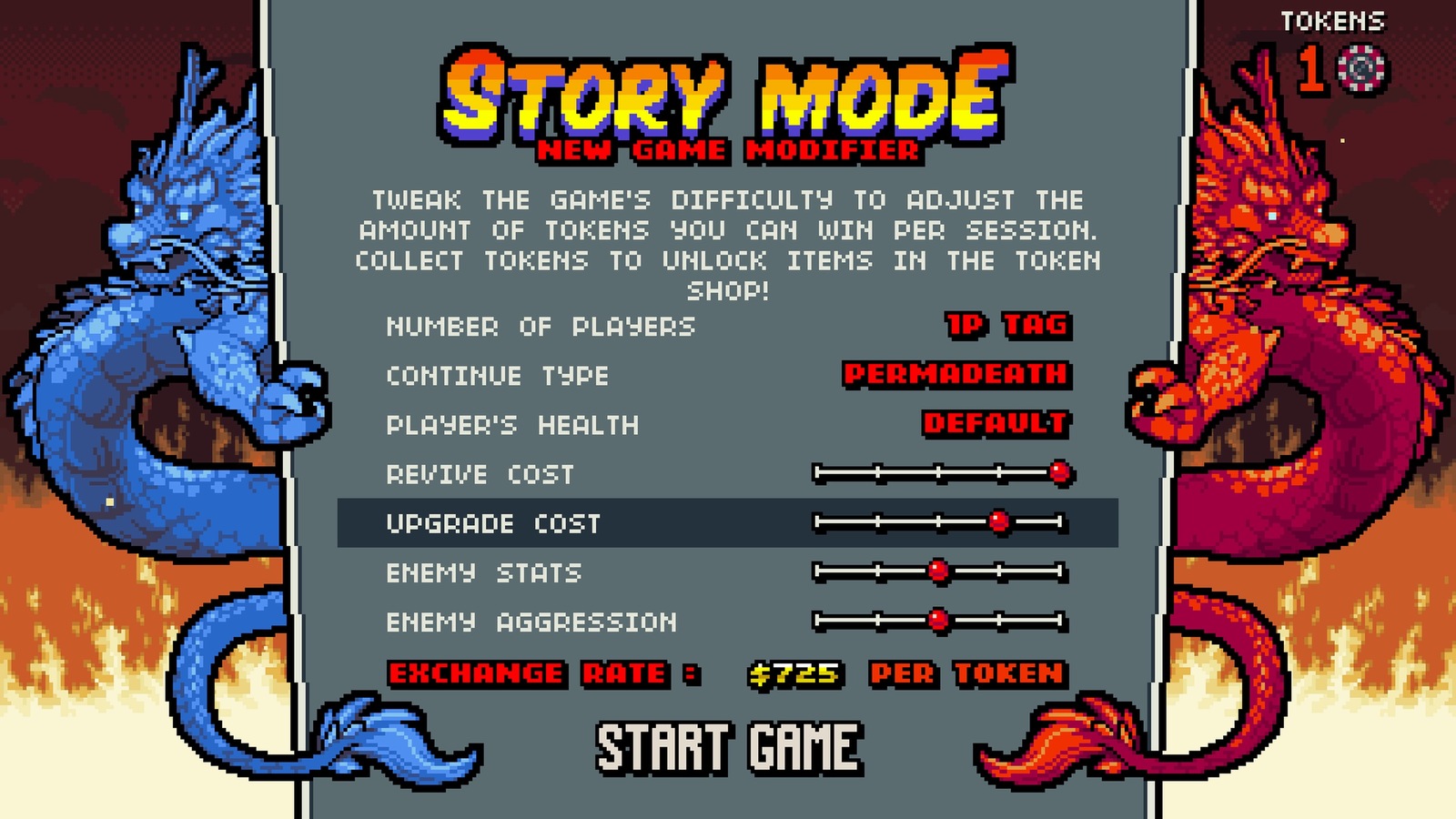 I bring this idea up because Double Dragon Gaiden disagrees with it, at least to an extent. Instead of crafting one single “good” vision of the game that everyone experiences, it builds a framework for offering a multitude of visions. You can tweak the difficulty of the game through different sliders like enemy stats or aggressiveness. The game utilizes a nonlinear structure where you pick which stage to tackle first, while the ones you don’t pick gradually expand in length and difficulty. As you progress through those stages, the game offers a random selection of upgrades for you to pick from in order to give you an edge. Depending on how you tweaked things, at the end you’ll cash in your points for a payout of tokens that can be used to unlock extra content.