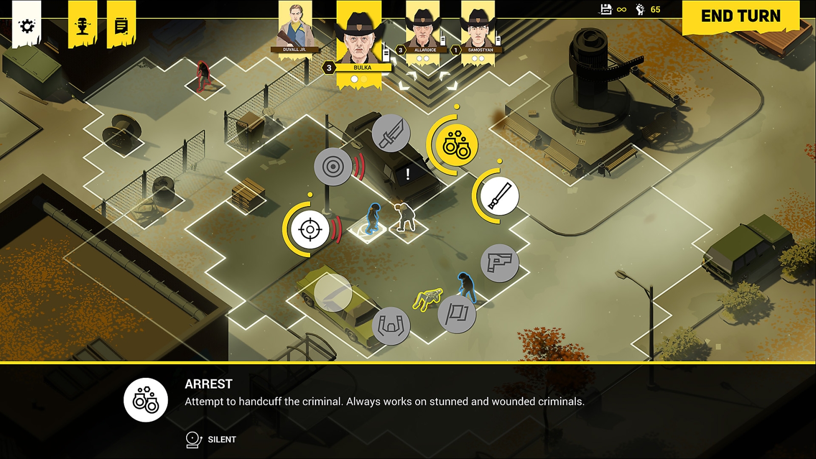 When I do knuckle down and play the game the way the developers likely intended, it works very much like other isometric tactical turn-based strategy titles. Each cop gets to take two actions per turn, and based on their equipment those actions can be shouting at a perp to get them to put their hands up, whacking them with a billy club, slapping on the cuffs, stunning them with a taser, throwing teargas or grenades, or slinging hot lead. You can also move at a normal pace, or sprint using both actions points. Killing a suspect leaves their corpse in plain view for others to see (though you can spend a point and some mobility to move the body), but arresting a suspect makes them disappear from the field. The beats are fairly familiar.