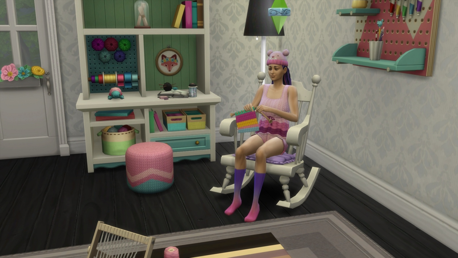 While my Sim started out only knowing how to knit some socks and adorable beanies, the skill leveled up fairly quick and before long I was making rugs, mailbox covers, hanging planters, and adorable plushies. I also crafted a cute little stool called a pouf, which you can see me sitting on below. Your Sim can not only wear the items you make, but can gift them, donate them, or put them on the new in-game marketplace called Plopsy.