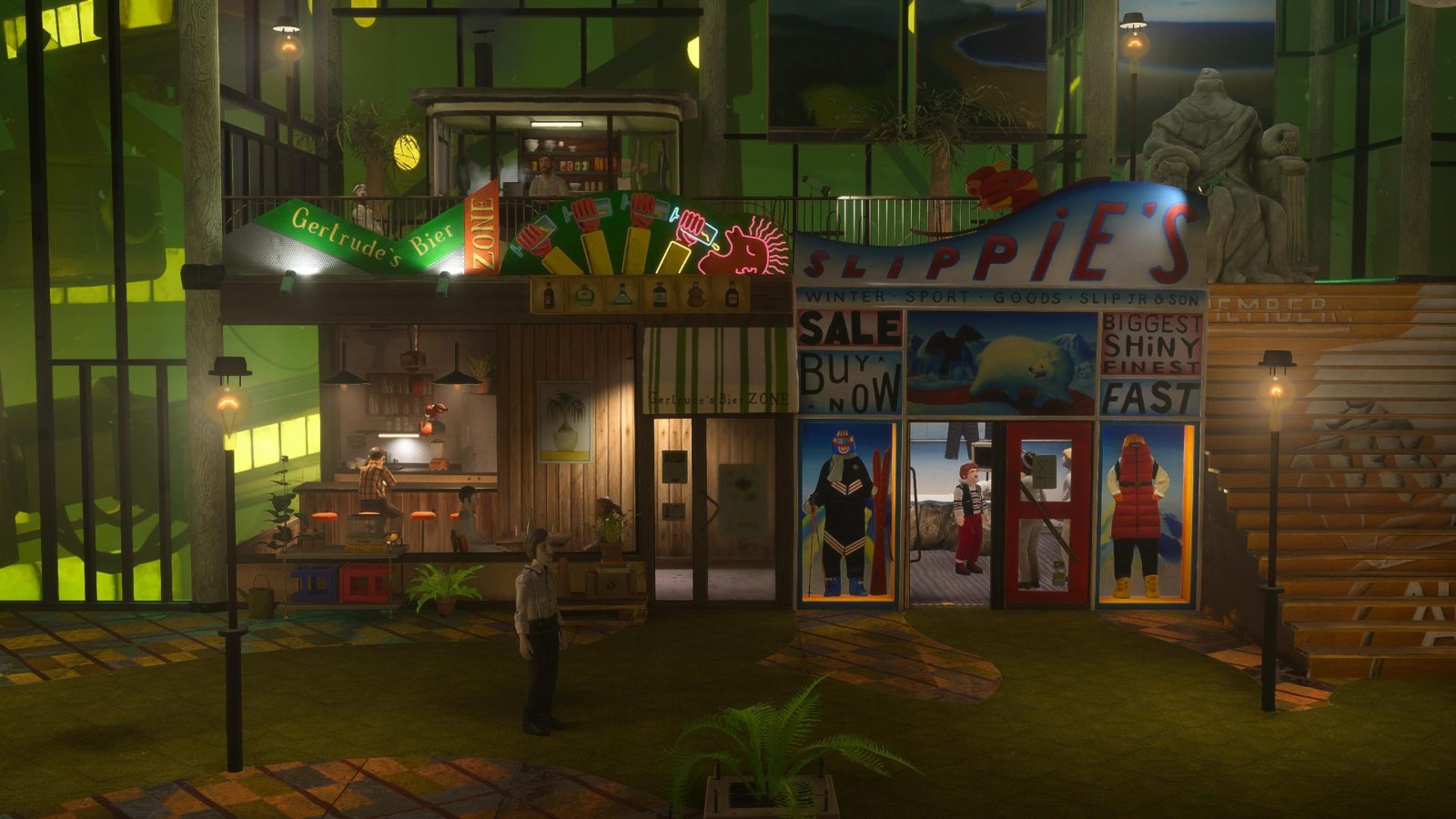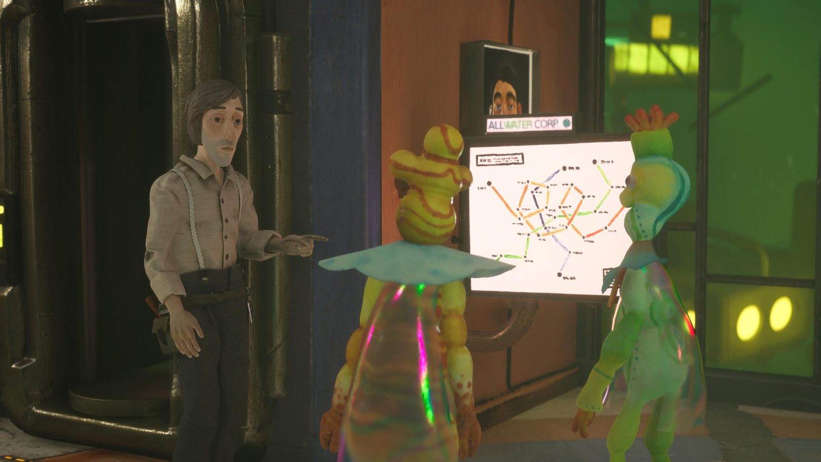 The cast is wonderfully voiced, with a wide range of personalities across the board. You’ve got the boisterous and proud Major who keeps would-be ne’er-do-wells in check, the reserved and bored arcade employee Rafi, the eccentric ski and snow gear salesman Slippie, just to name a few. When you’ve lived on a sequestered spaceship your whole life, it certainly helps to get to know one another, and it was satisfying getting to converse with and learn more about everyone I encountered, human or otherwise. One of my personal favorites has to be Captain-At-Large Zoya, the pilot of the FEDORA, or he would be at least if the ship was flight-worthy. While he puts on a brave face for everyone on the ship (his bird Coco included), not everything is as peppy as it seems. He’s struggling to find his place and live up to his title, and helping him overcome his self doubt was an intimate exchange between friends that felt well executed as the days went by. The cast of Harold Halibut is certainly one of the best aspects of the game overall, and I was always looking forward to what strange scenario I might encounter next.