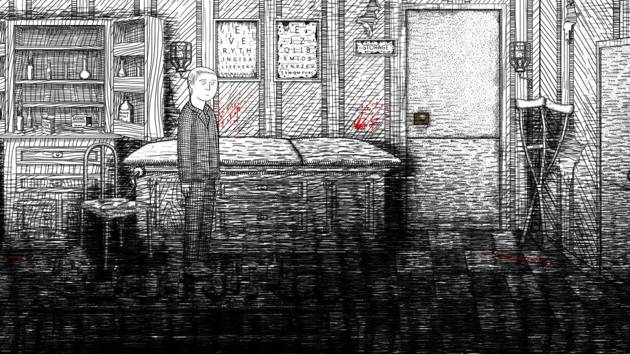 The most striking feature of Neverending Nightmares is its art style. Coming across as hand-drawn, the use of hash marks for darkness and black and white helps sell the overall sense of dread. Cleverly, color is only utilized for interactable objects and blood, setting them apart inherently from the drab surrounding environment. Much attention has been paid to detail, as background objects contain subtle hints of unease, and shadows, sometimes cast from multiple light sources, extend their reach over the house. If the art were more consistent, it would be the driving source behind recommending this game. Sadly, there are notable and frequent dips in this singular selling feature.