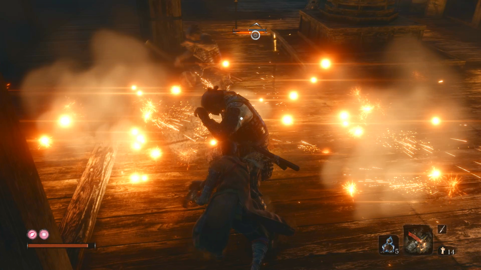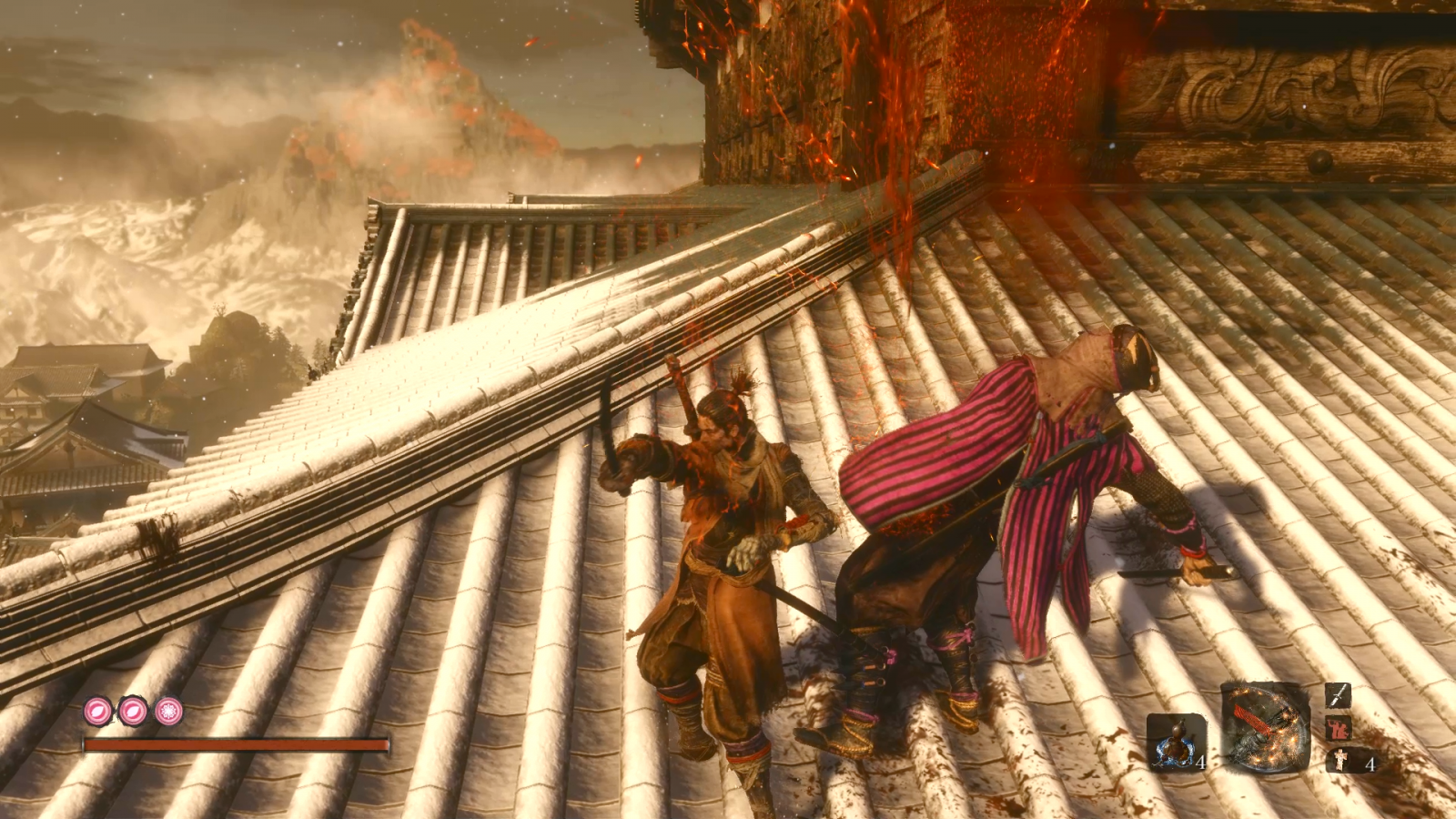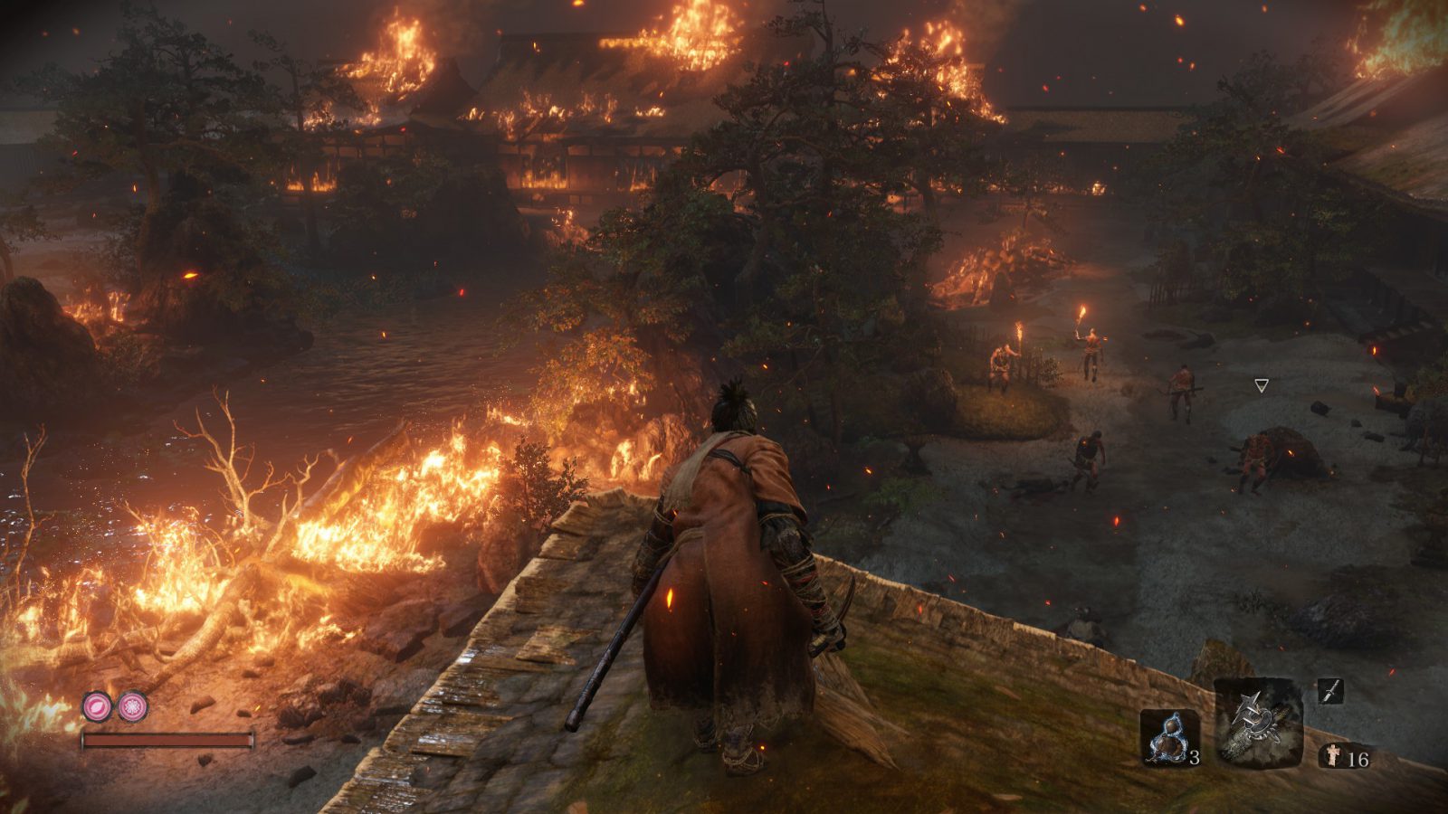 Sekiro has its share of weaklings who you can dispatch with a few quick slashes, but even they’ll surprise you now and again with a perfect parry or some dirty trick. There are some enemies that I did my best to avoid outright every time I saw them. That’s a surprisingly common option in Sekiro. If a fight isn’t going your way, there’s more often than not a way to duck out of it, either to just blow past it or to re-establish stealth and kill your opponent from the shadows. Sekiro is a stealth action game. It gives both halves of that genre equal share, and if you neglect either one, you’re going to have a rough time. If an enemy — even a mini-boss — is giving you trouble, there’s often a better way to approach to get the drop on it. And if you screw that up and find yourself clashing swords, raw skill and smart item use will get you out of jams that you wouldn’t believe. Going from Dark Souls to Bloodborne is turning from prey to predator, and Sekiro takes that transformation even further, making you an armed-to-the-teeth master assassin. I was trained by Soulsborne games to be patient and wait for an opening to attack; in Sekiro, you have to make your own openings by being aggressive and slipping through your opponent’s guard.