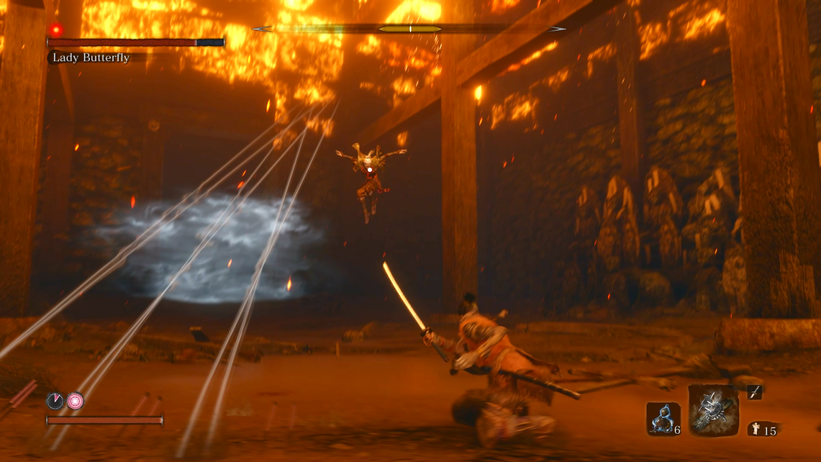 Very few of Sekiro’s bosses embody the “big monster that hits hard” archetype that so many Soulsborne bosses did. Instead, most are roughly human-shaped, and taking them down relies much more on quick reflexes and clever strategy than on stamina and the ability to get out of the way. Still, some branch out in some truly unpredictable directions. When you’re used to clashing swords with samurai, it’s quite a shock the first time you find yourself locked in an arena with a supernatural abomination that looks ripped straight out of Lordran. Most boss fights take place in multiple stages, as each time you land a deathblow, they’ll switch up their fighting style. You can never get too comfortable with your strategy, even when your foe is at the brink of death. I’ve seen bosses use new moves on my 10th time fighting them and change their patterns as soon as I had memorized them. Even in the most controller-crushingly difficult encounters, I always came around to appreciating their design — usually after I’d beaten them and worked out my frustration. Bosses are as much about your mechanical skill as they are about your ability to find and exploit their weaknesses.
