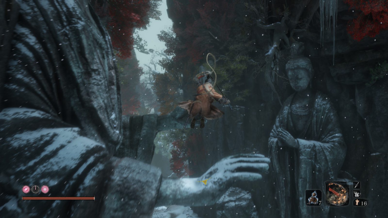 Sekiro is much more grounded in reality than any of the Soulsborne games, and as a result, it has less variety in its levels. Expect to spend more time in mountain temples and less in crystal caverns. There are a few excursions to more fantastical environments, but those levels tended to be disappointingly short and not all that different from more mundane areas. The levels themselves are well designed and full of alternate routes, but they’re not quite as memorable as those in Dark Souls or Bloodborne. One signature feature of the original Dark Souls is how its levels twisted around one another, entwining some of the earliest and latest areas in the game. Sekiro doesn’t stick to the same trick, instead trying some of its own. You can progress through most levels in a pretty clear, linear way, but they’re also full of side paths, shortcuts, and secret passages to discover. Traversal is the most fun it’s ever been in a From Software game, thanks to your grappling hook, which lets you quickly dart through levels or get the jump on your enemies. It’s hard to overstate just how big of a deal this change is. Rather than being funneled through dark corridors, you’re given both the blessing and curse of having to make your own way through. Most levels are extremely vertical in design, and you’ll always want to be on the lookout for a better path to where you’re heading. Sekiro also has you return to some locations multiple times, but in a way that’s genuinely exciting rather than tedious.