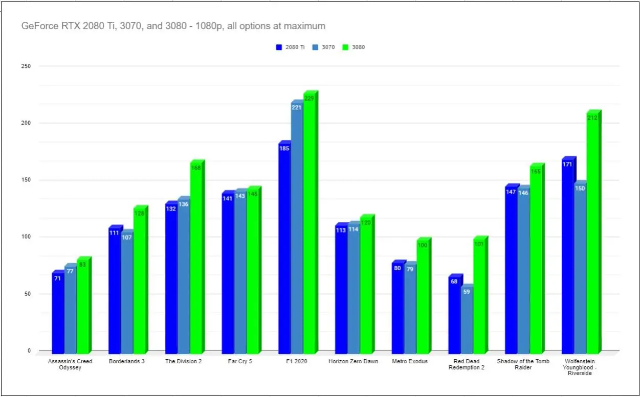 I think it’s important to include the 3080 in our analysis, as well as the previous generations of cards in our benchmarks, so I’m including them in our benchmarks on the 3070. (I’ll be able to show you what Watch Dogs: Legion that looks like on the 28th, so stay tuned) We’ll be updating this graph as shiny new RTX-powered games hit the market, so stay tuned — this graph is going to get very exciting. That said, realize that I’m running pre-release drivers –these numbers will likely improve and spread out as the game releases hit and NVIDIA’s drivers mature.